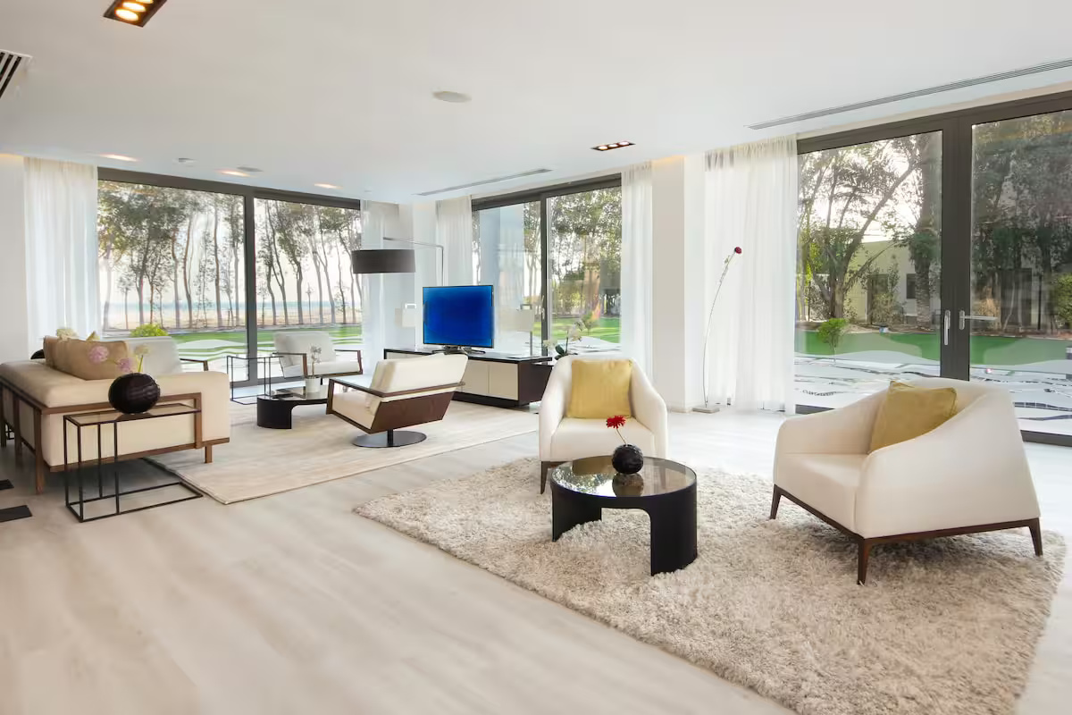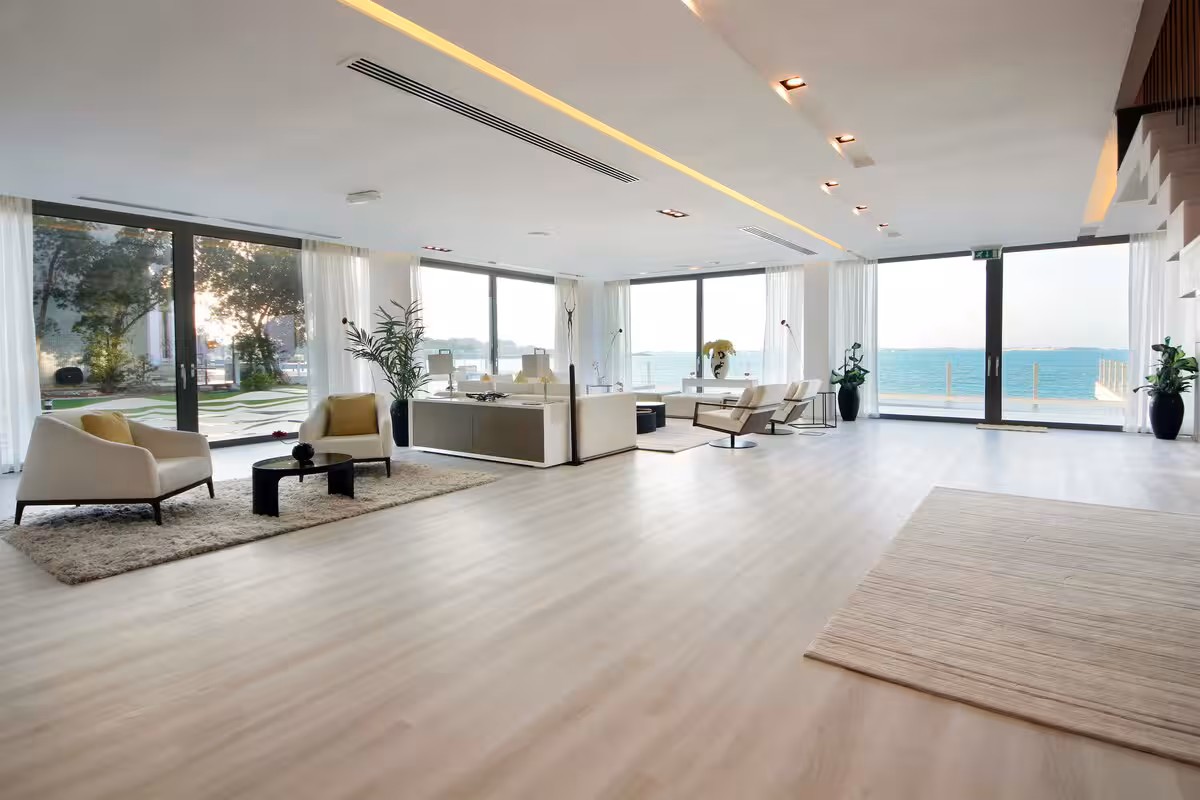 The living room is bright and expansive, featuring floor-to-ceiling windows that reveal stunning waterfront views. With elegant white and beige furnishings, soft ambient lighting, and a sleek minimalist design, the space exudes a serene sophistication and inviting comfort.