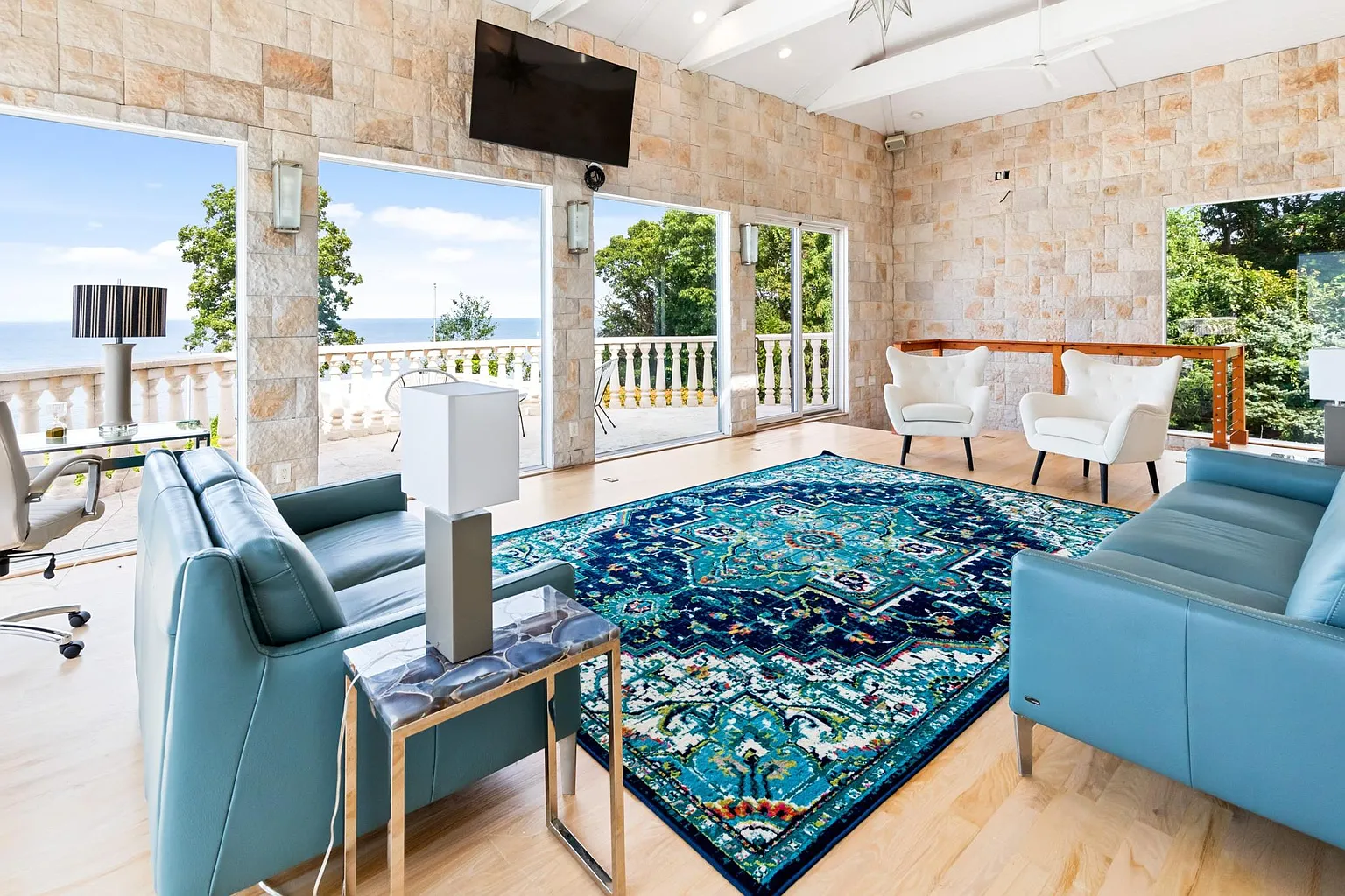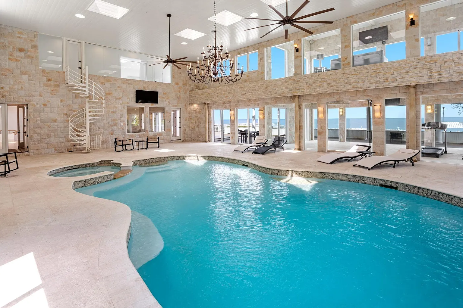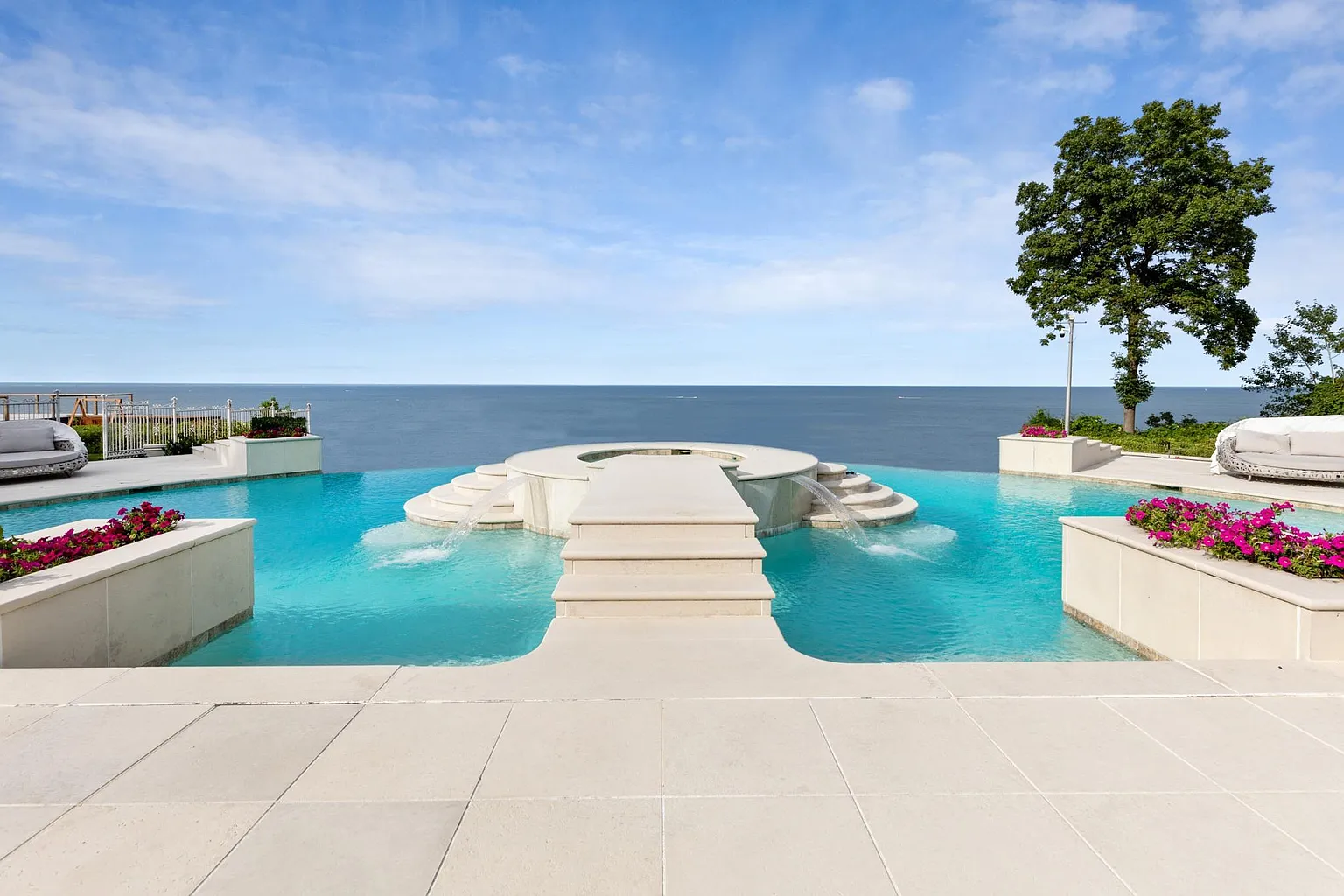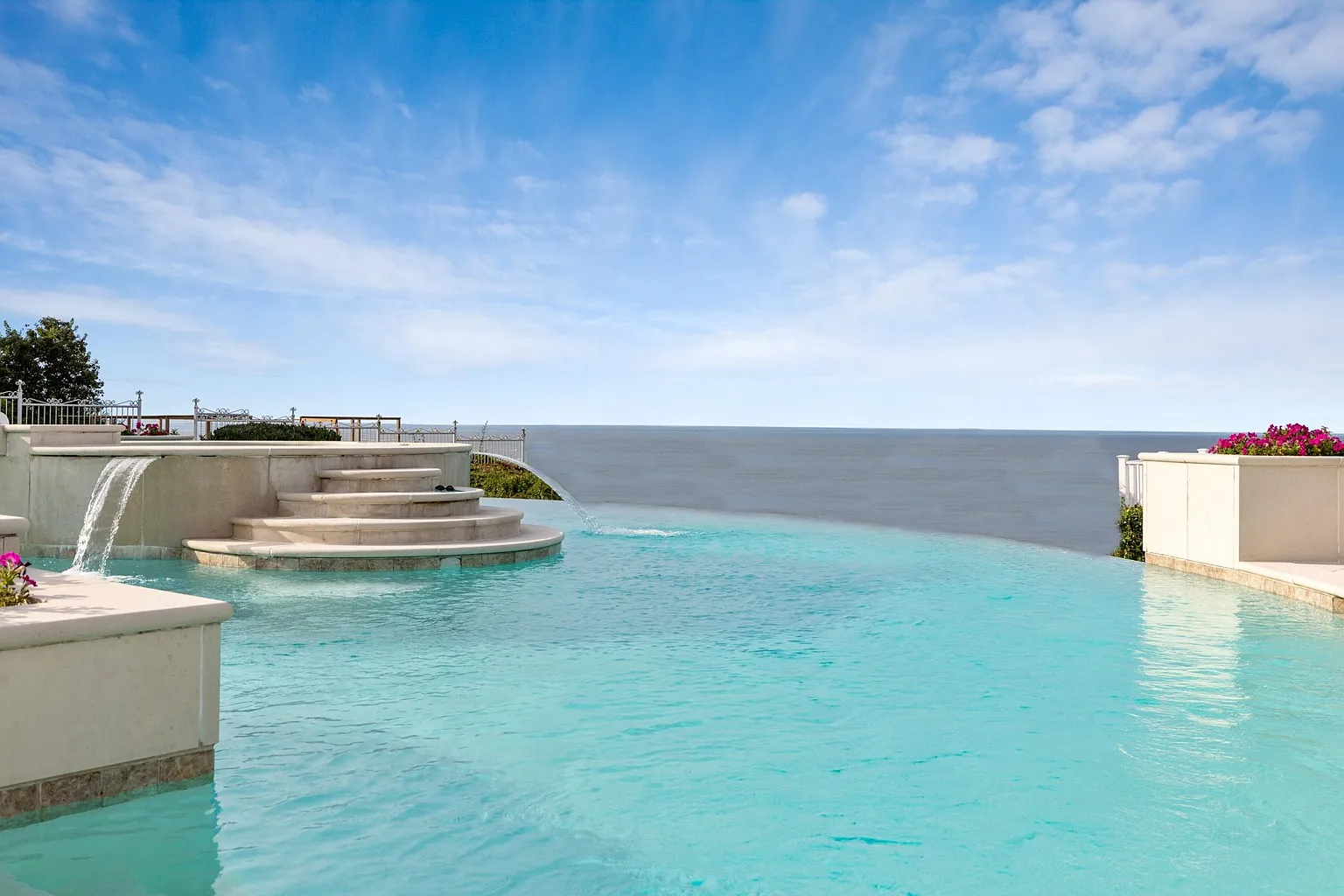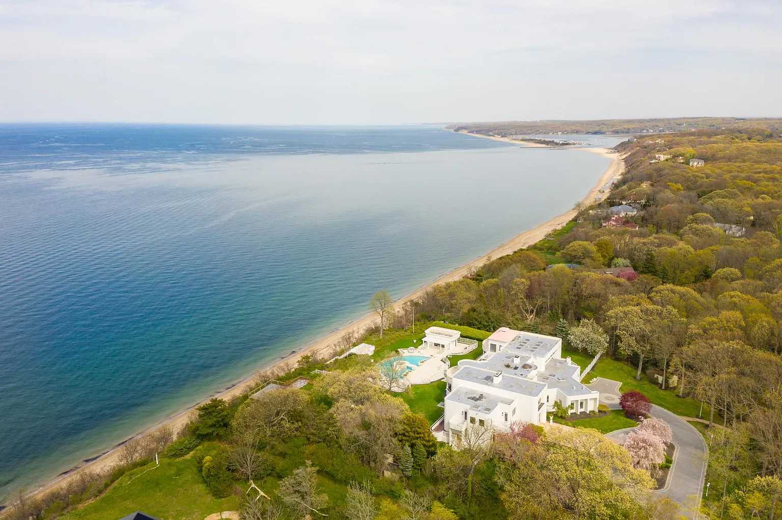 New York’s most beautiful beachfront estate, located on the enchanting Belle Terre Peninsula in Port Jefferson. This sprawling 25,000-square-foot mega-mansion is situated on an 8.2-acre private, gated estate with 310 feet of sandy beach frontage along the New York and Connecticut Sound. Newly renovated and fully furnished, the estate features 11 bedrooms, 15 bathrooms, five kitchens, an indoor pool and spa, an outdoor infinity pool, a pool house, three saunas, a guest cottage, tennis and basketball courts, a gym, game rooms, a movie theater, and much more. The perfect blend of luxury and comfort, this property offers an unparalleled living experience.