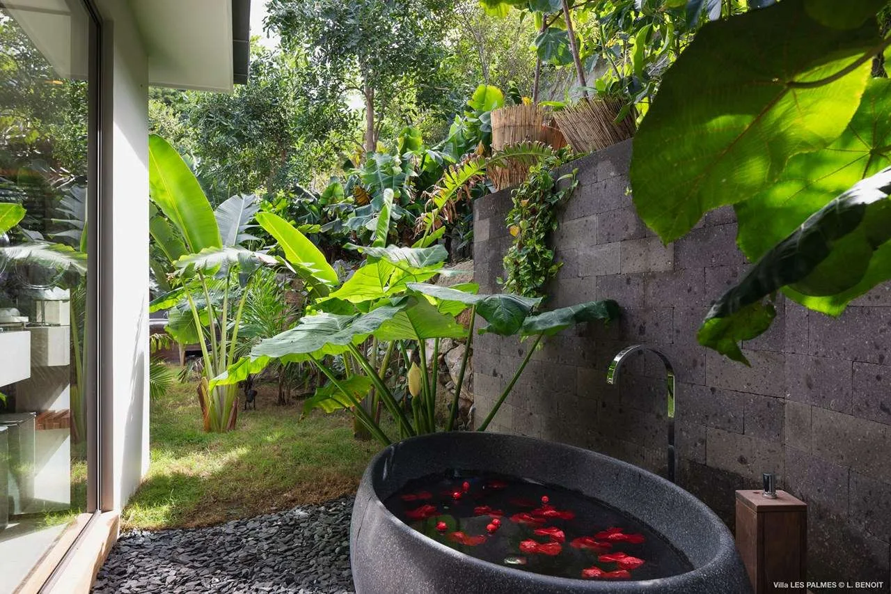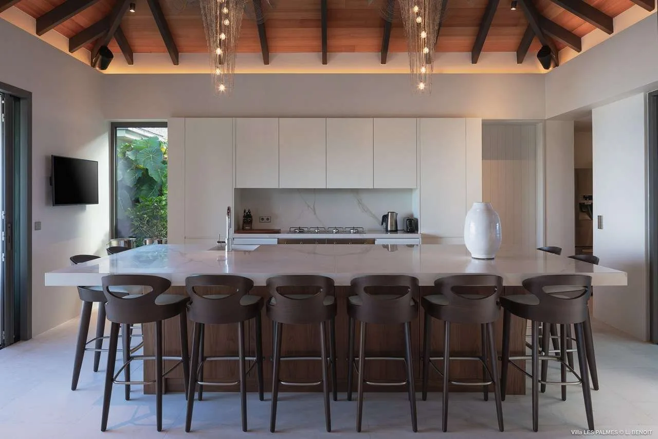 Step into a world of tropical elegance in the main house, where three light-filled, interconnected reception rooms seamlessly flow into a stunning 16-meter swimming pool. This inviting space encourages guests to unwind in the lounge areas or indulge in al-fresco dining under the sun. The villa is adorned with bespoke furniture and artwork collected from around the globe, creating a sophisticated atmosphere that beautifully blends comfort with luxury.
