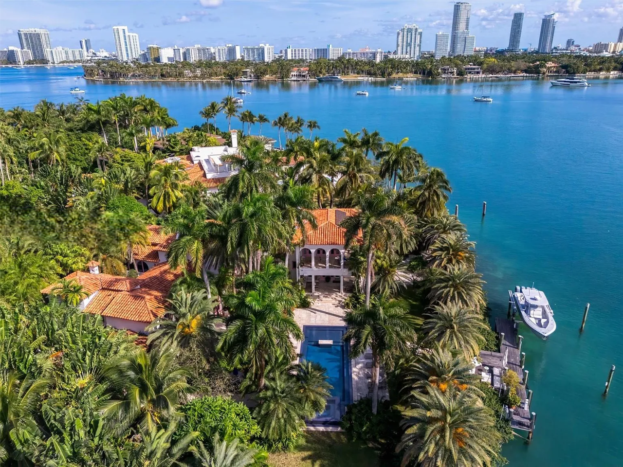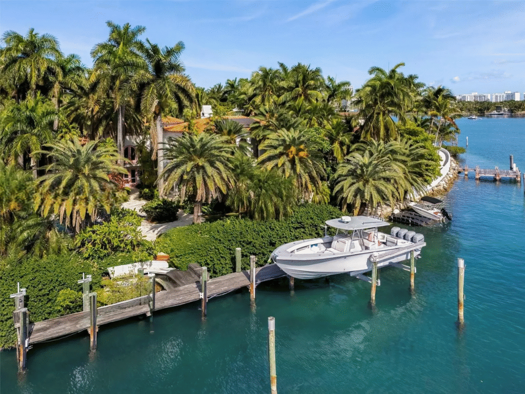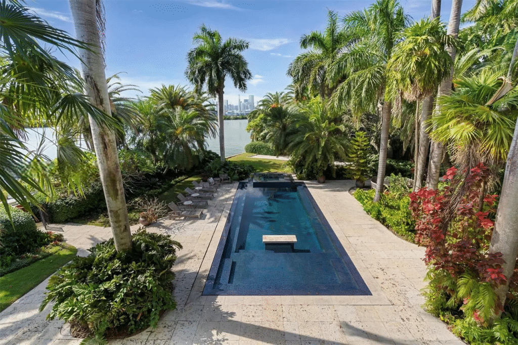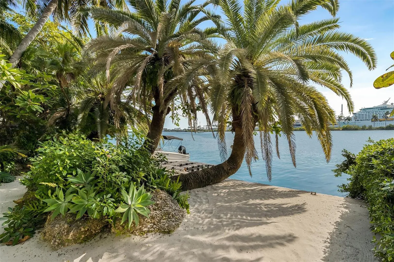 This exquisite Mediterranean Revival estate masterfully integrates timeless architecture with contemporary luxury. Fully renovated in 2009, the residence is situated on a generous 35,348 sq. ft. lot within the prestigious Palm Island community, boasting 220 feet of coveted south-facing waterfront that can accommodate yachts up to 205 feet in length. The thoughtfully designed expansion features a lavish primary suite, a gourmet chef’s kitchen, and a spacious family wing, ensuring ample room for relaxation and entertainment.
