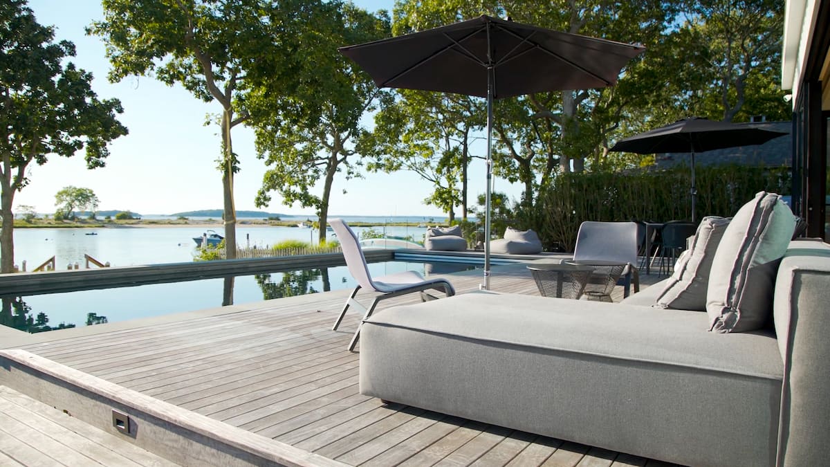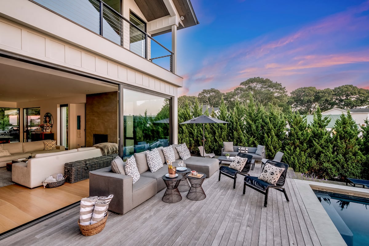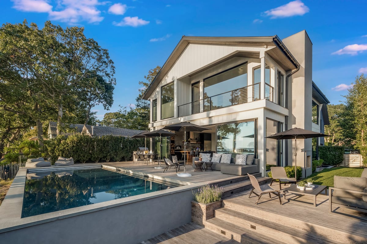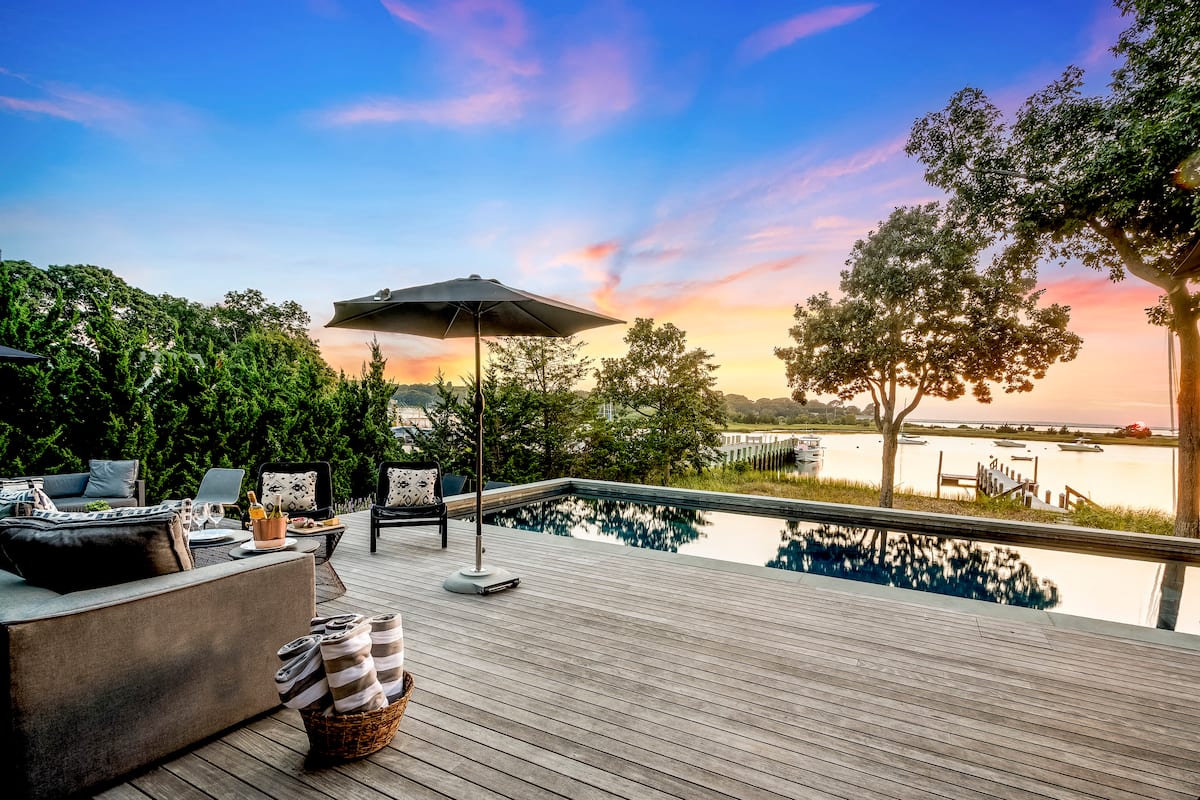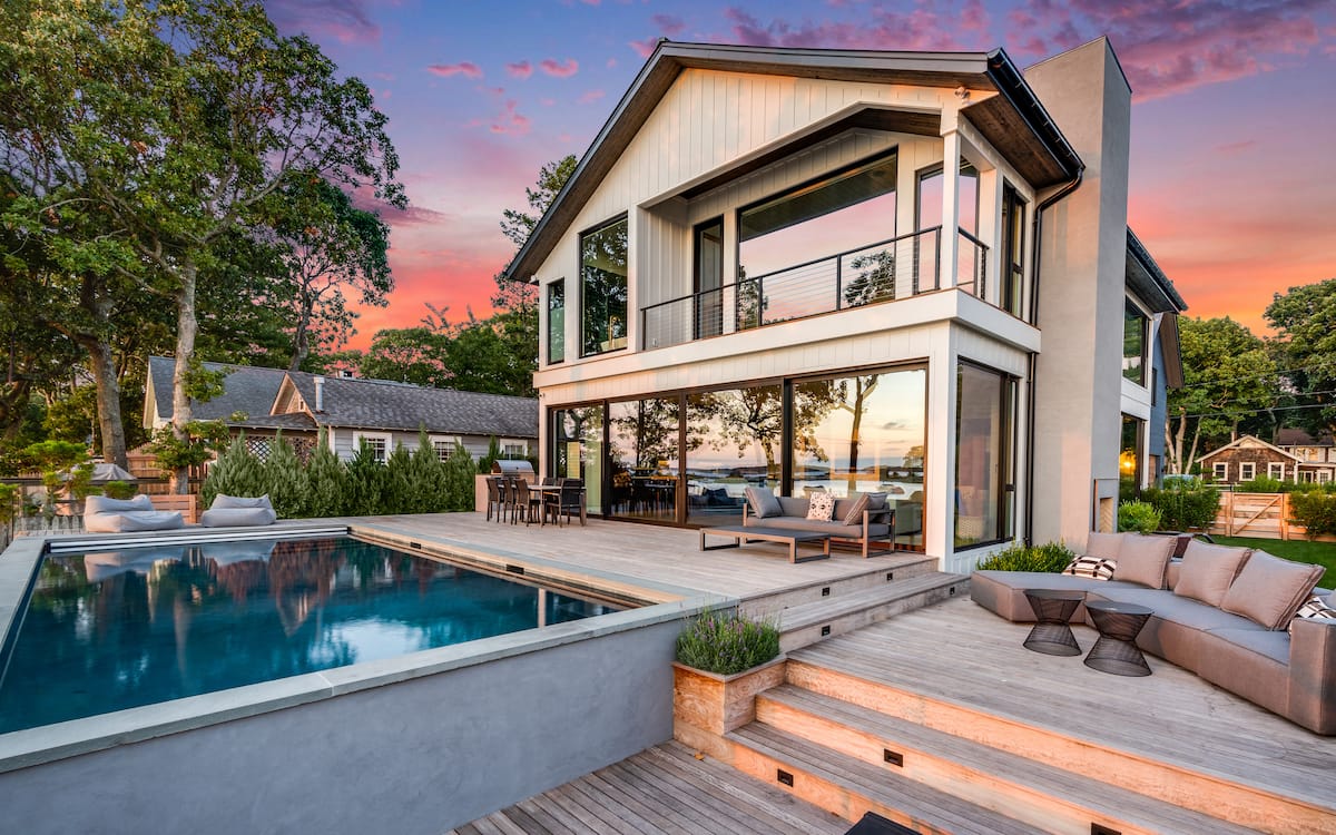 Enjoy the most spectacular sunsets over the water from this contemporary waterfront Sag Harbor home.