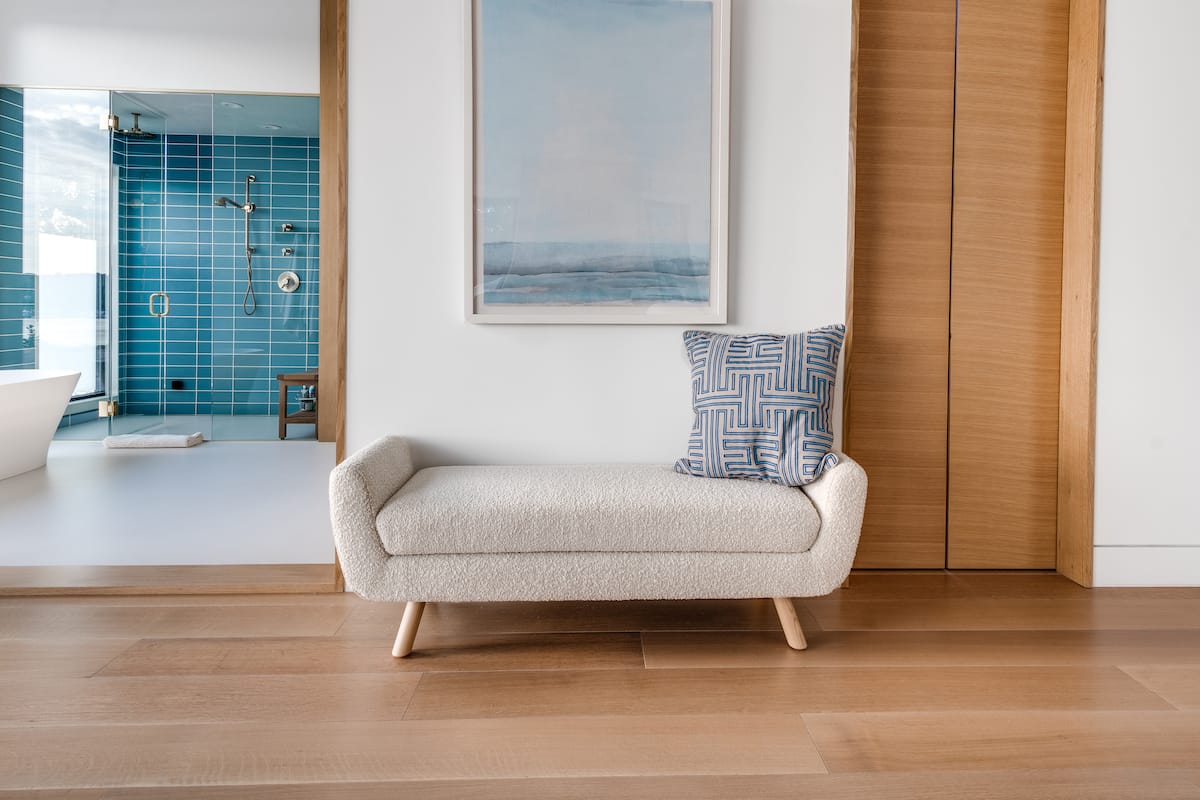 • Bedroom 1 – Primary: King size bed, Ensuite bathroom with stand-alone rain shower & bathtub, Walk-in closet, Television, Private balcony