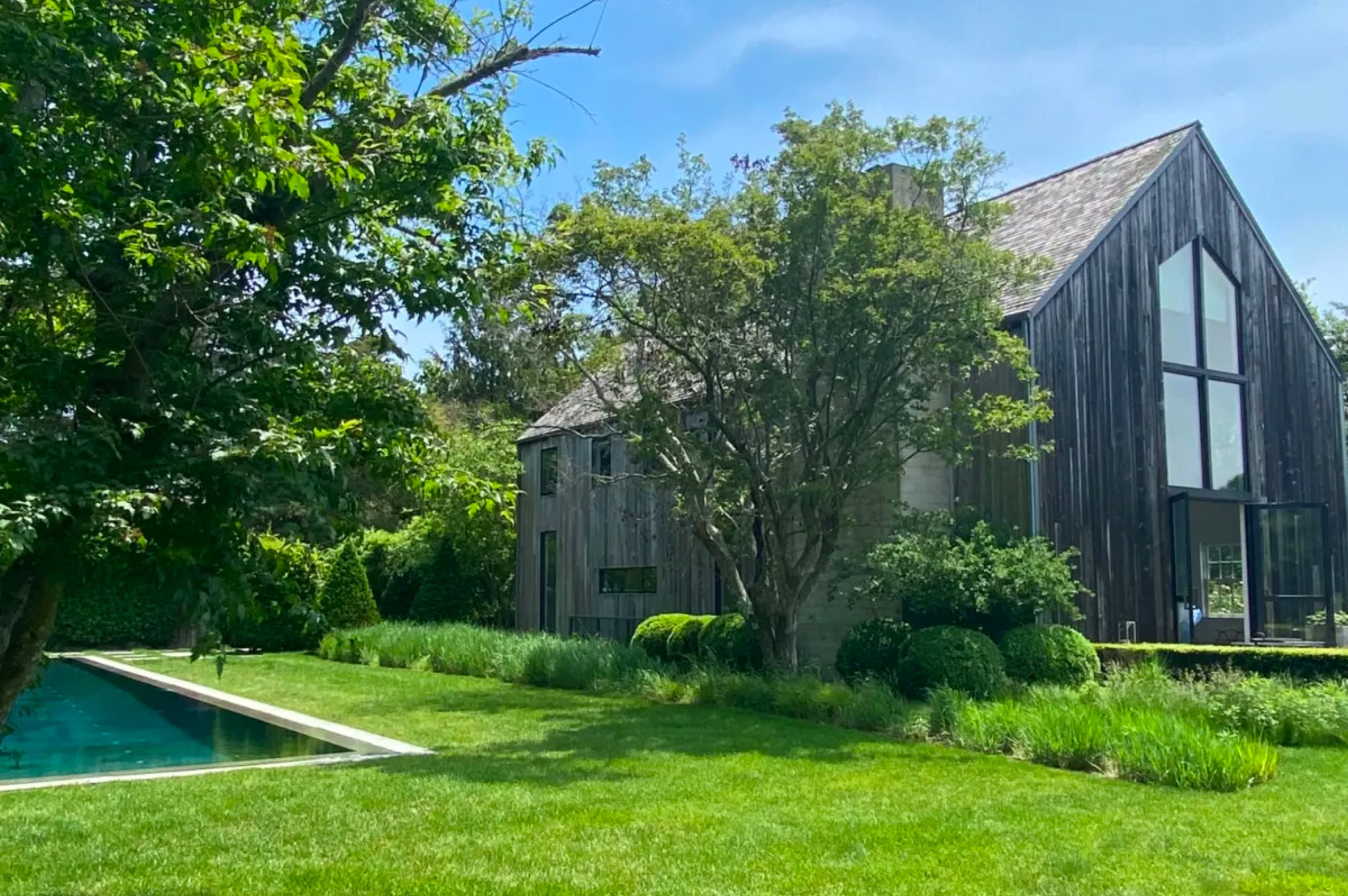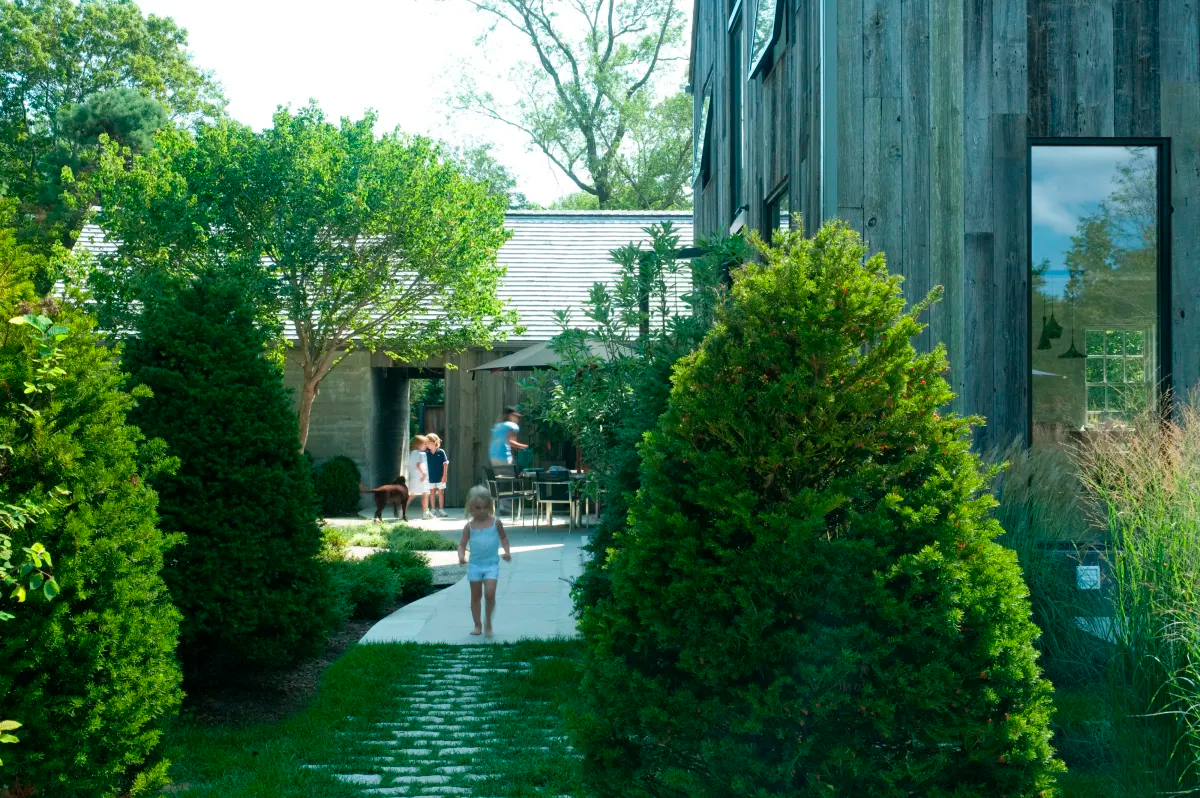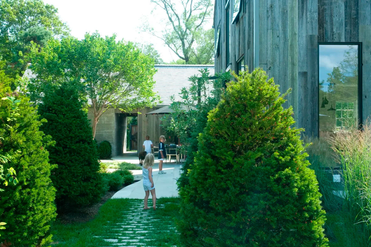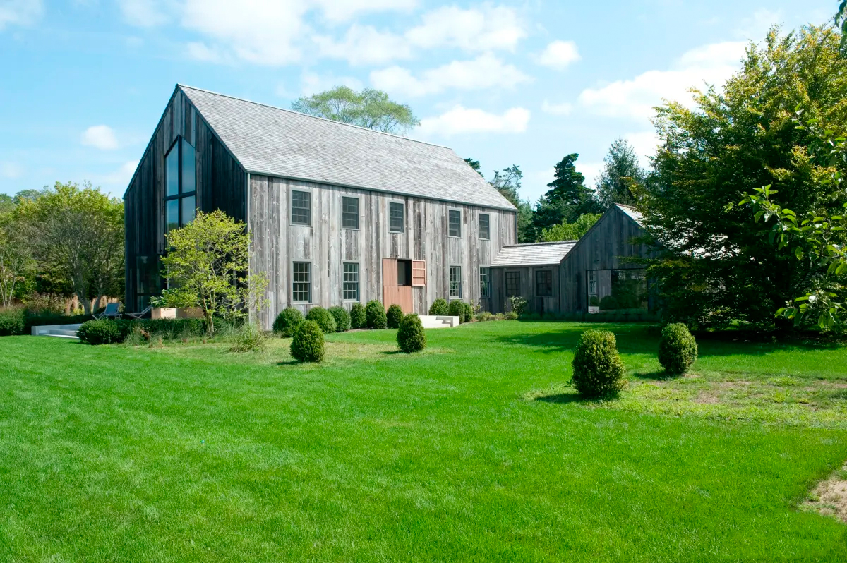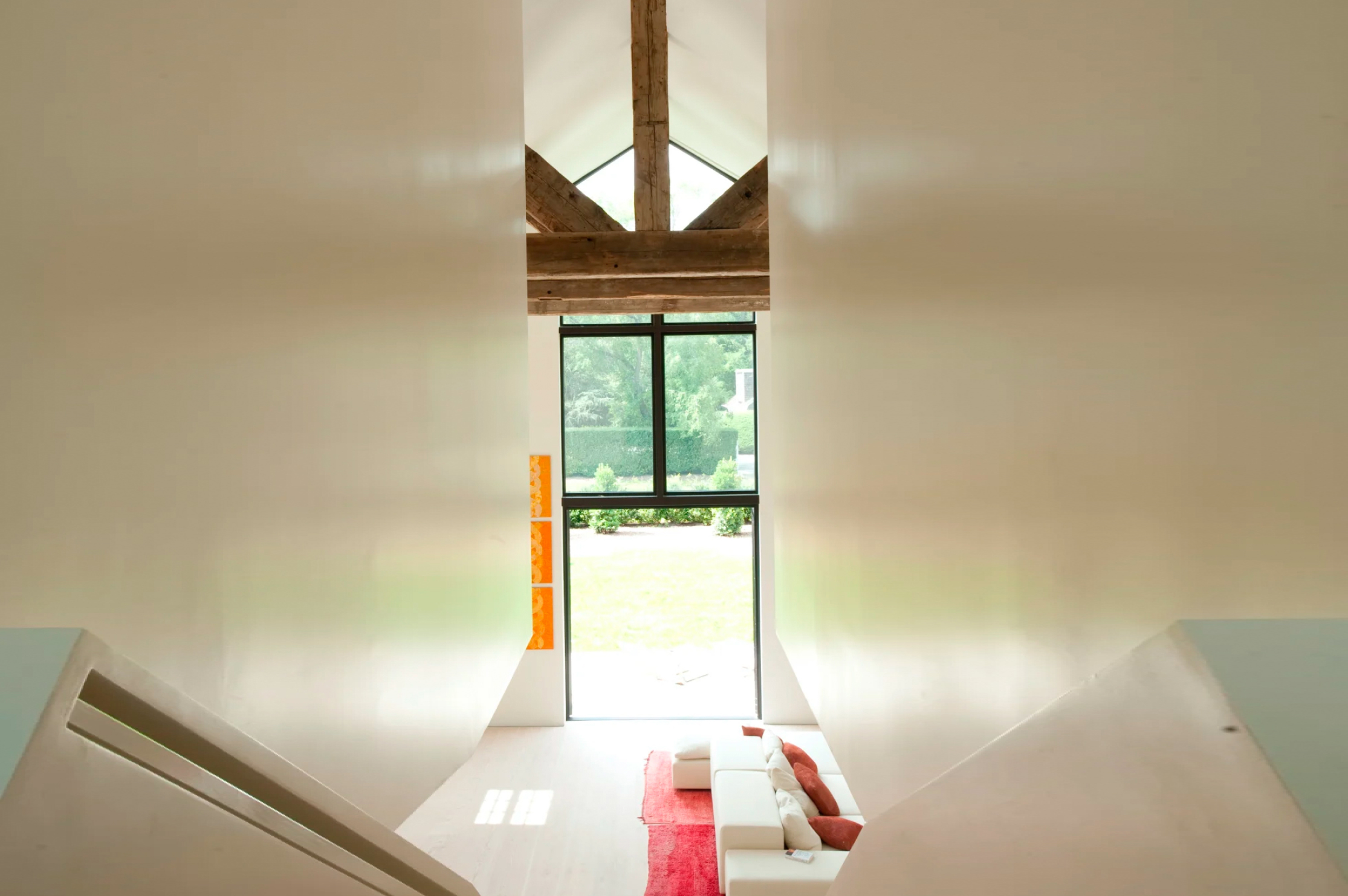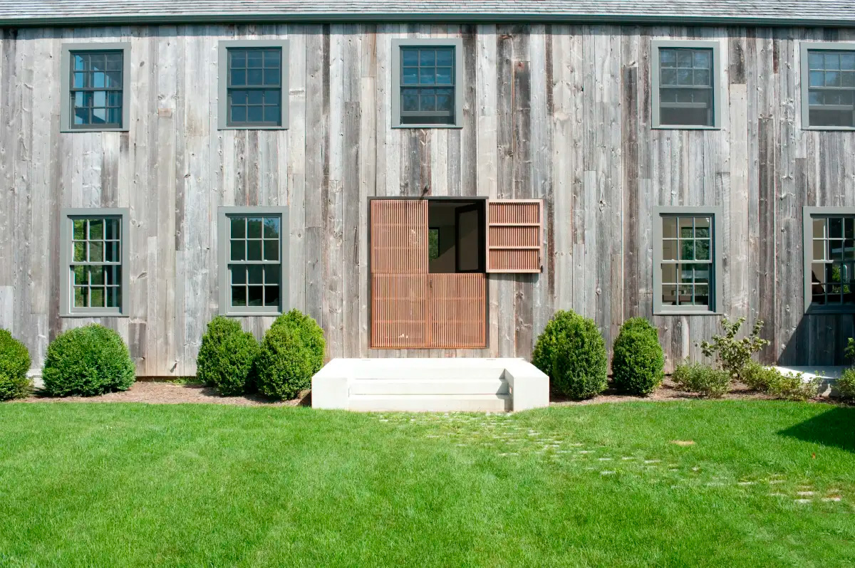 This property beautifully integrates a strong connection to nature with an open floor plan, highlighted by a striking central staircase that exudes a minimalist, almost monastic vibe. To enhance the character of the 1980s faux barn, D’Haene replaced sections of standard cedar siding with reclaimed planks from a 200-year-old barn, adding a sense of history and charm. The original cedar remains on a smaller structure that connects to the expanded garage, which now features a combined yoga studio and media room at the front, along with two parking spaces at the back.