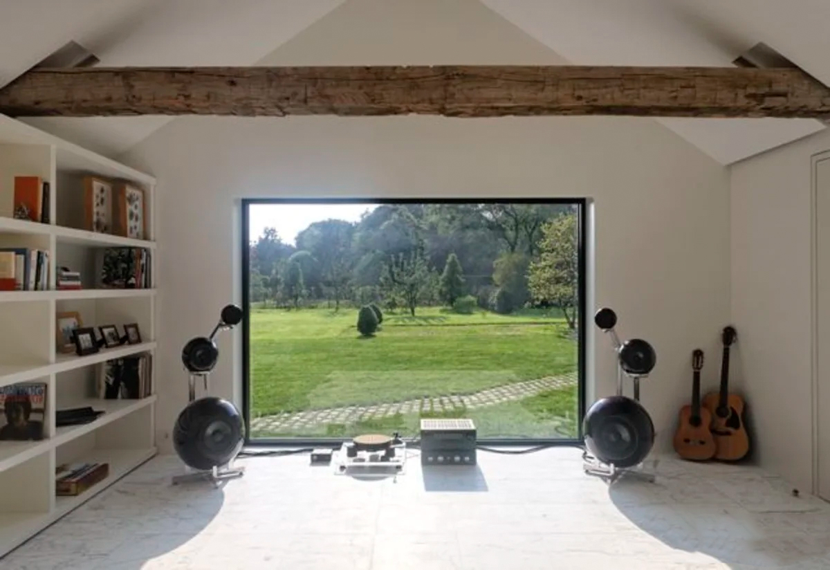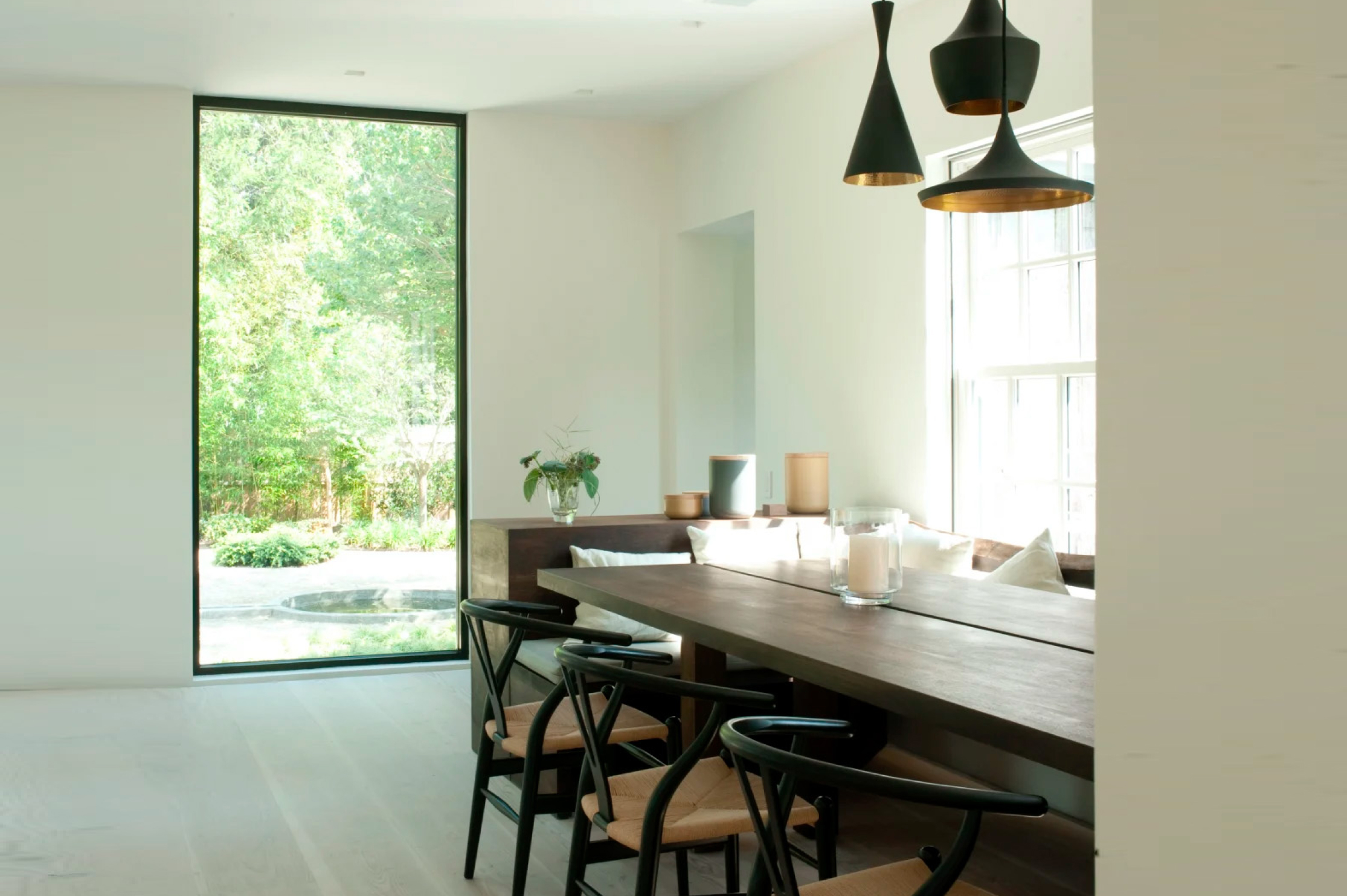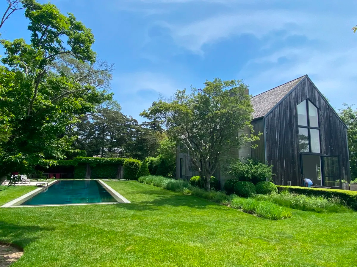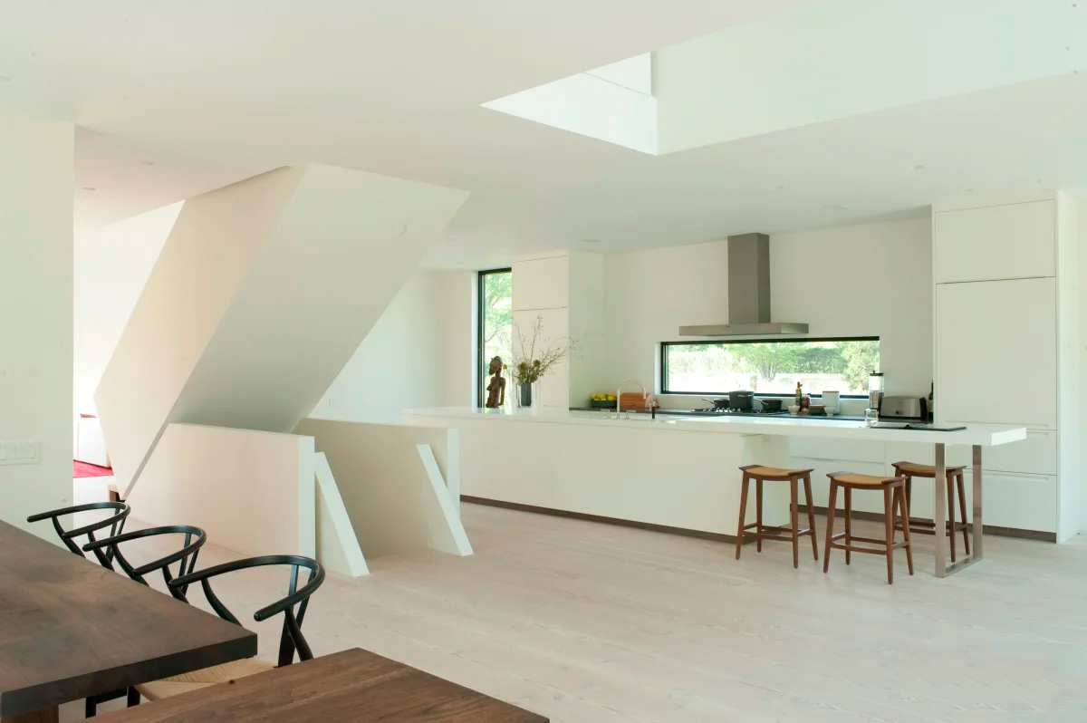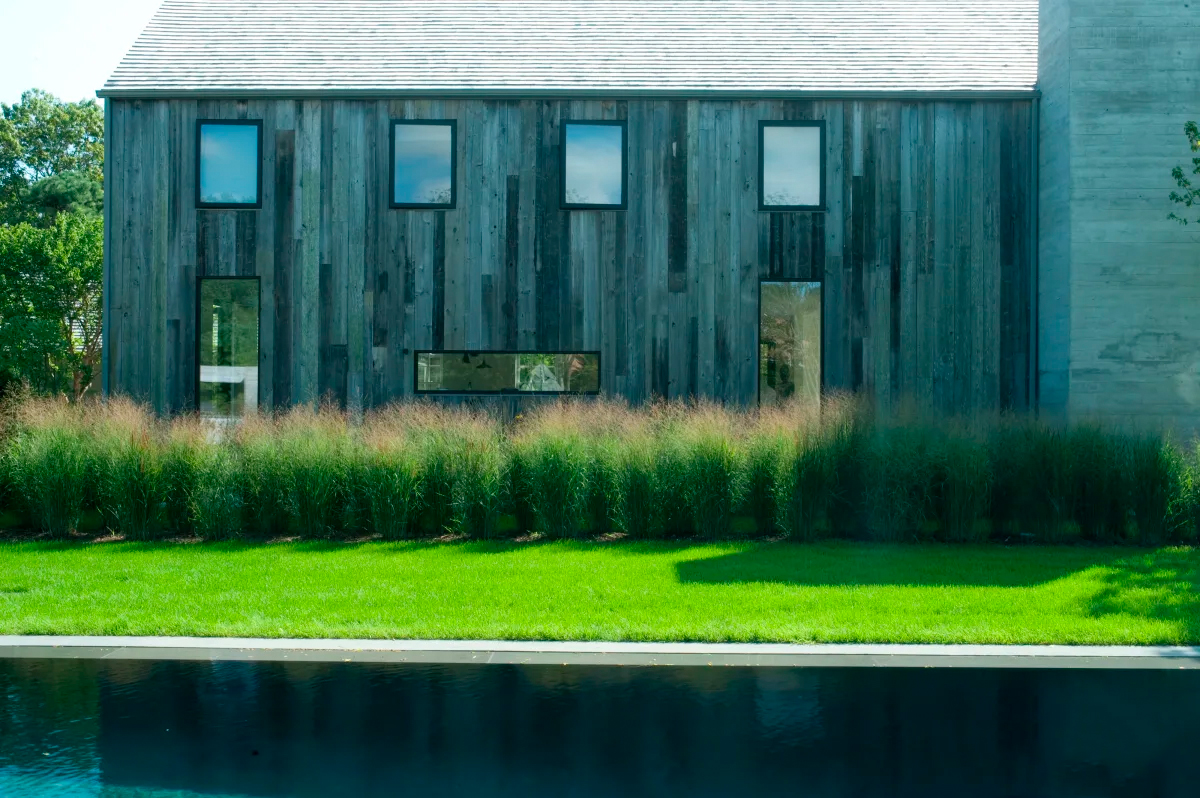 This property beautifully integrates a strong connection to nature with an open floor plan, highlighted by a striking central staircase that exudes a minimalist, almost monastic vibe. To enhance the character of the 1980s faux barn, D’Haene replaced sections of standard cedar siding with reclaimed planks from a 200-year-old barn, adding a sense of history and charm. The original cedar remains on a smaller structure that connects to the expanded garage, which now features a combined yoga studio and media room at the front, along with two parking spaces at the back.