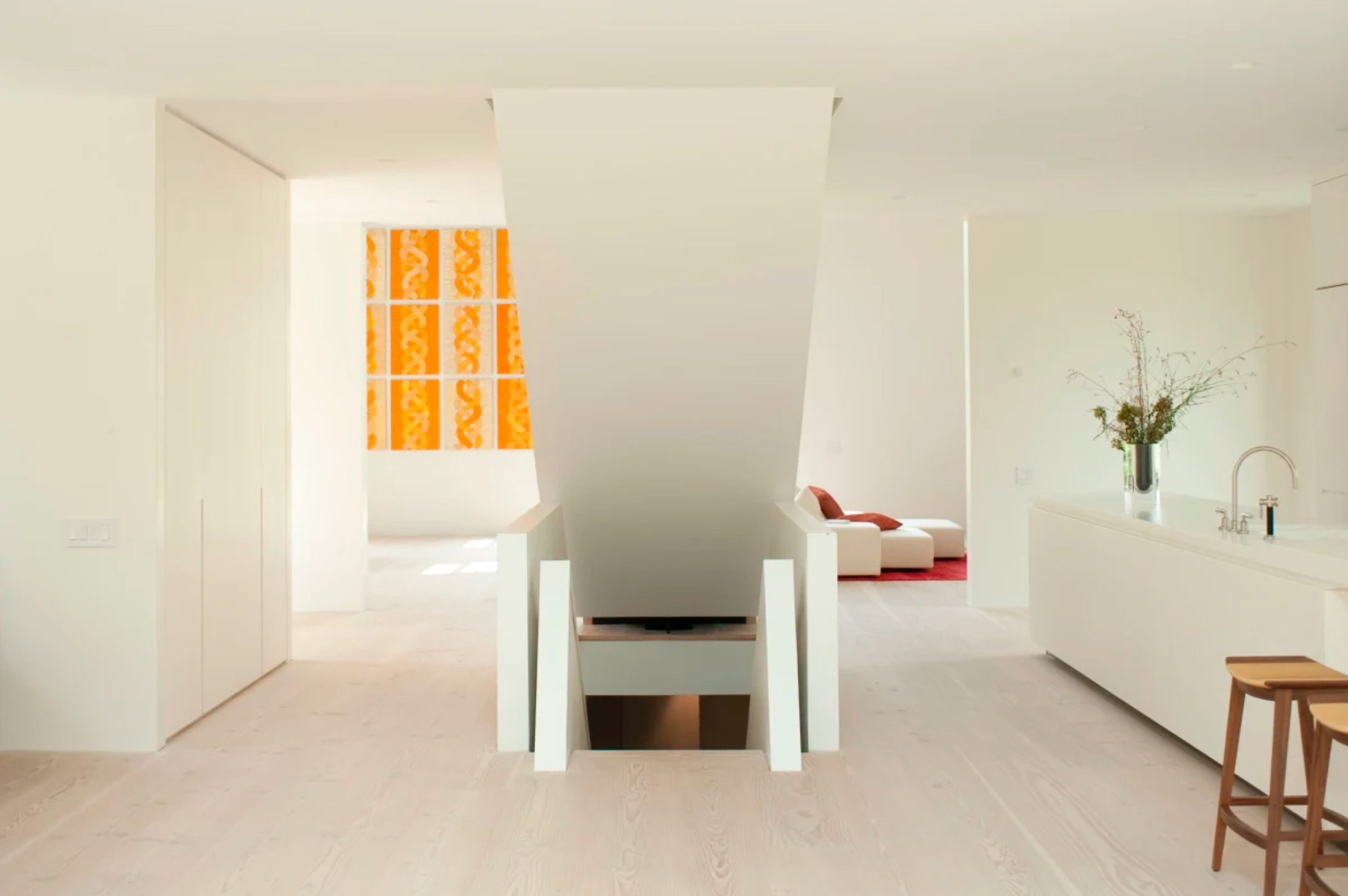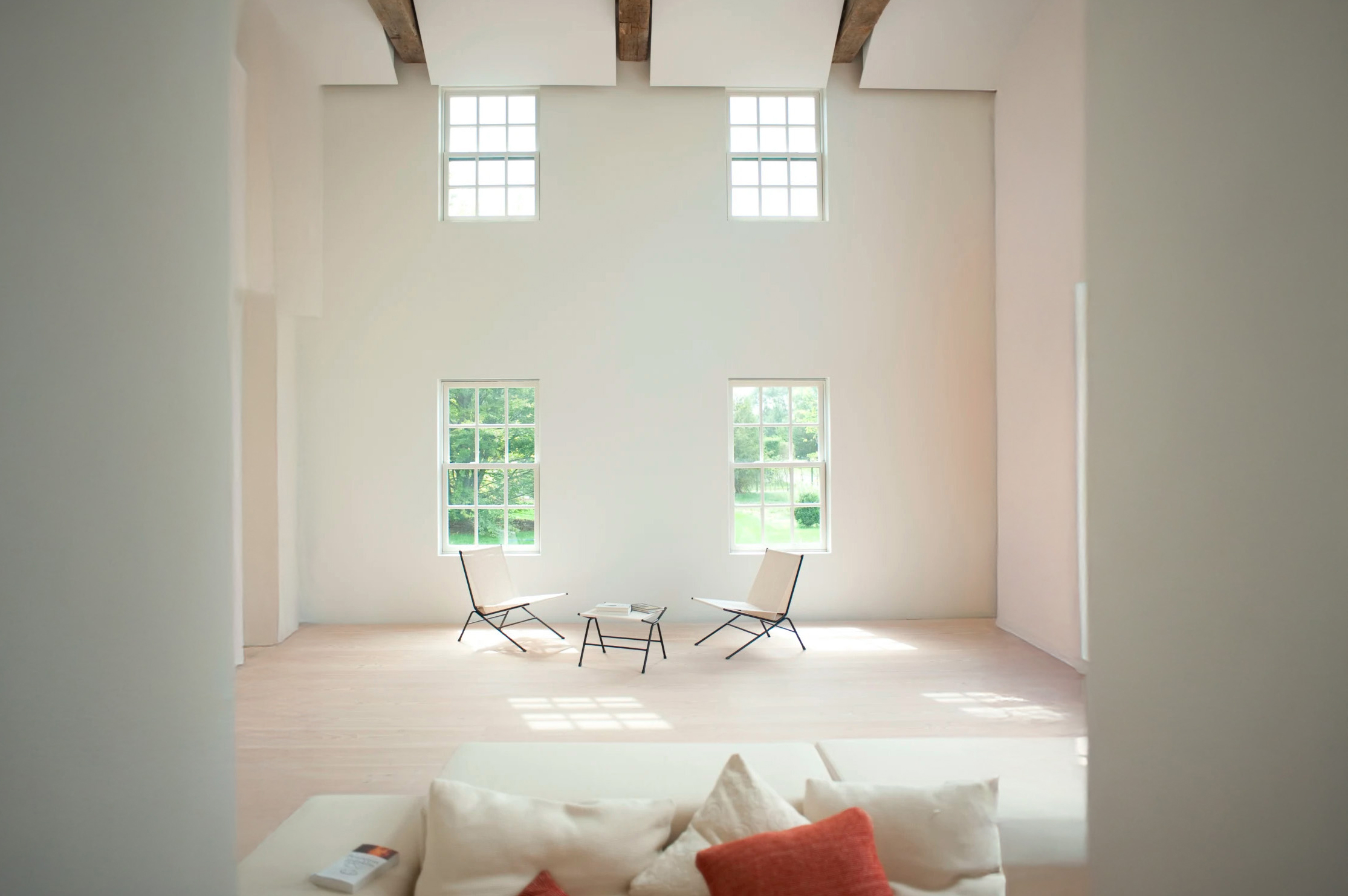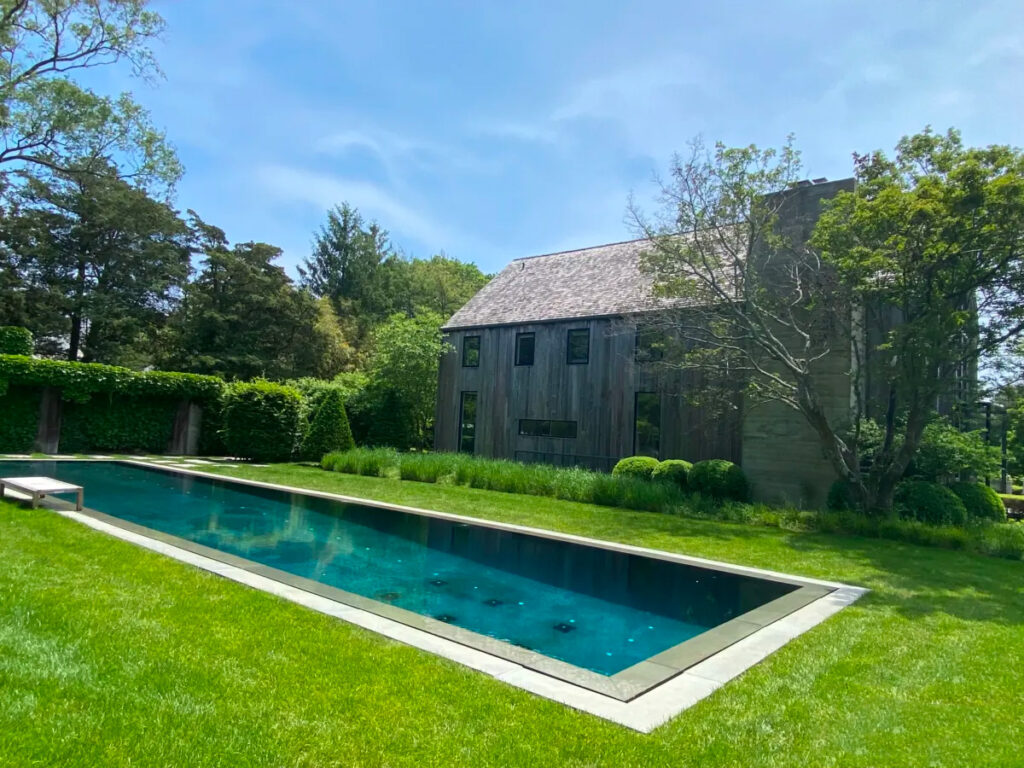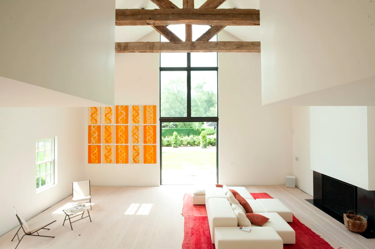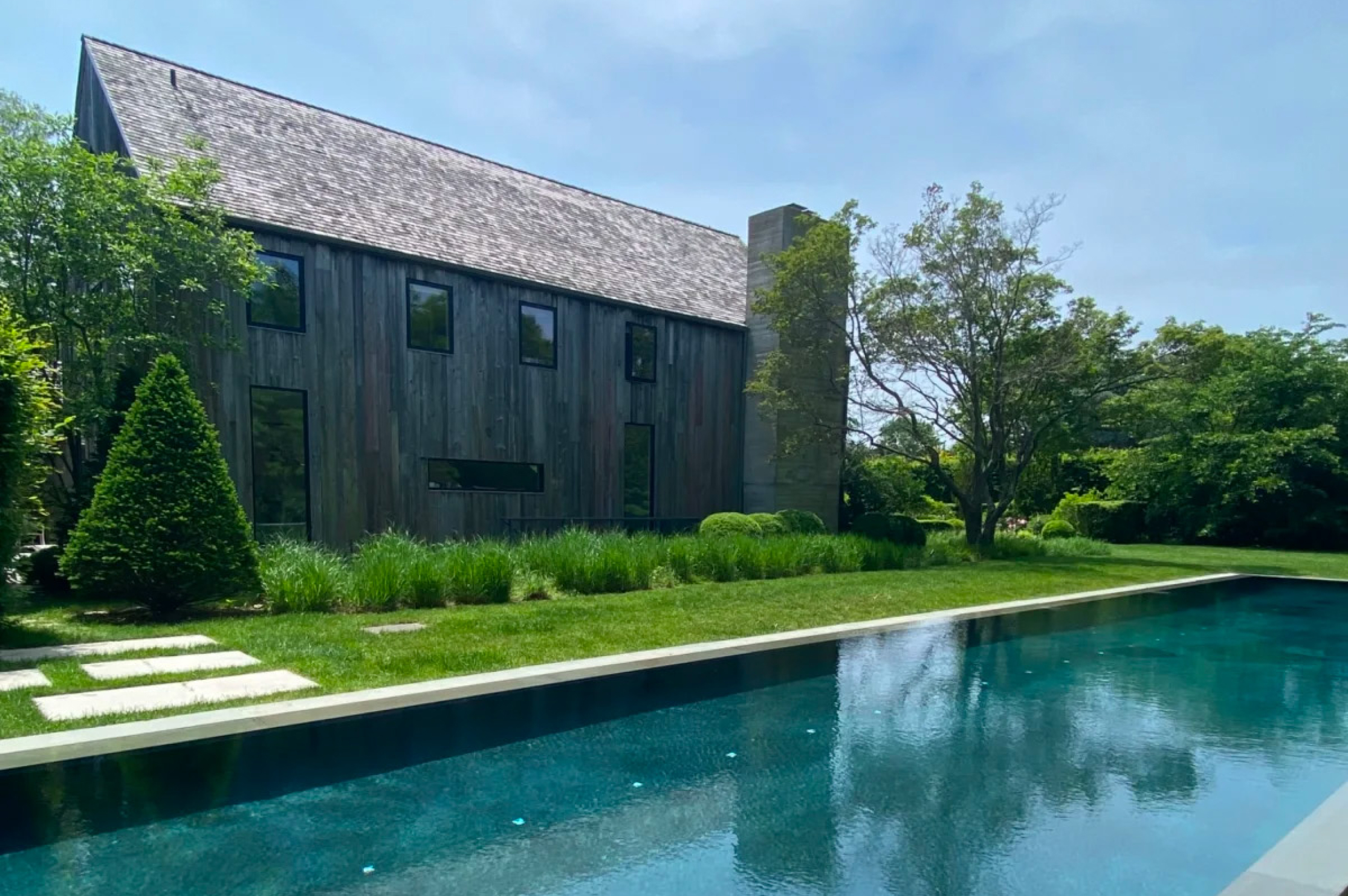 This property beautifully integrates a strong connection to nature with an open floor plan, highlighted by a striking central staircase that exudes a minimalist, almost monastic vibe. To enhance the character of the 1980s faux barn, D’Haene replaced sections of standard cedar siding with reclaimed planks from a 200-year-old barn, adding a sense of history and charm. The original cedar remains on a smaller structure that connects to the expanded garage, which now features a combined yoga studio and media room at the front, along with two parking spaces at the back.