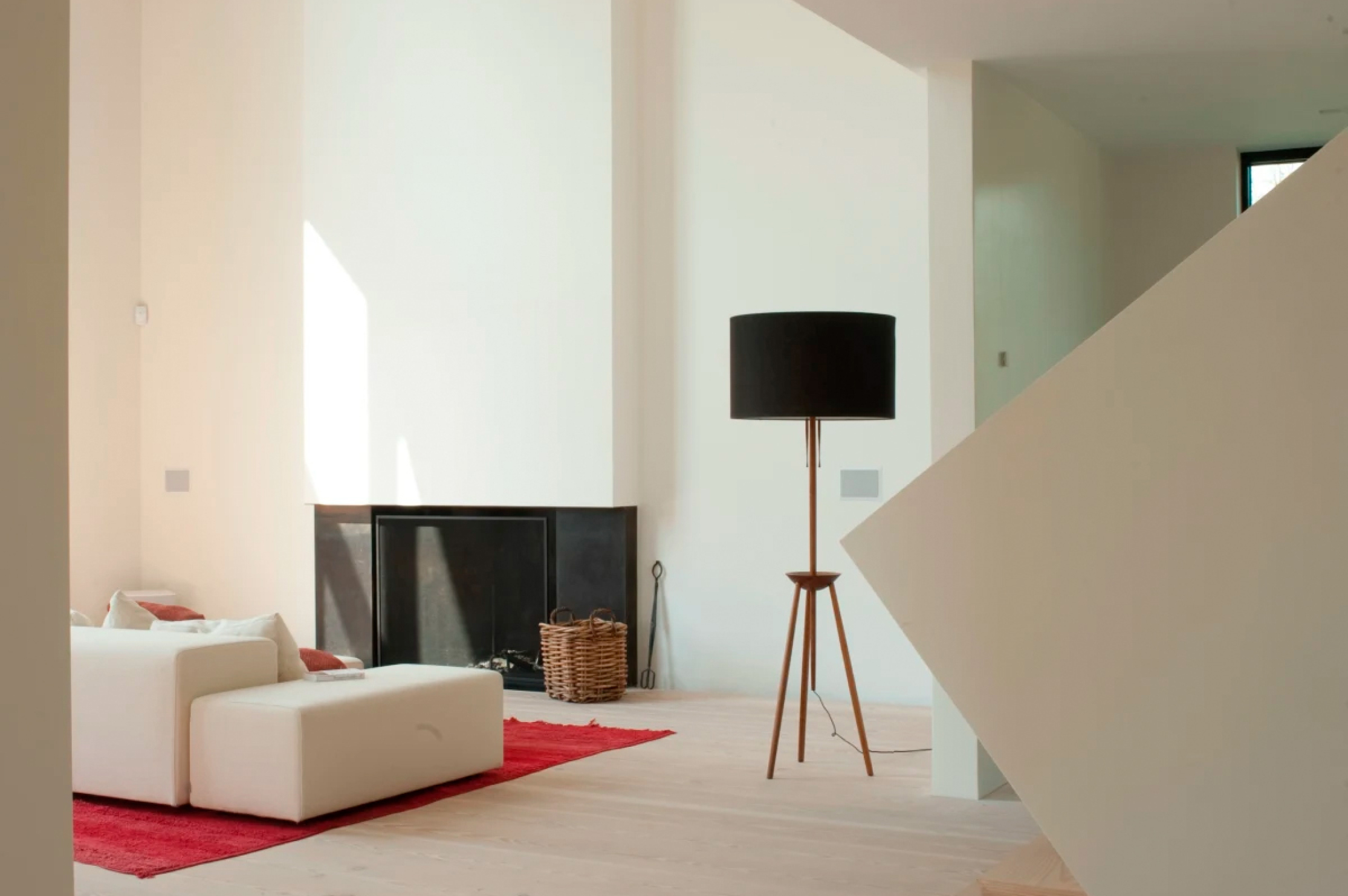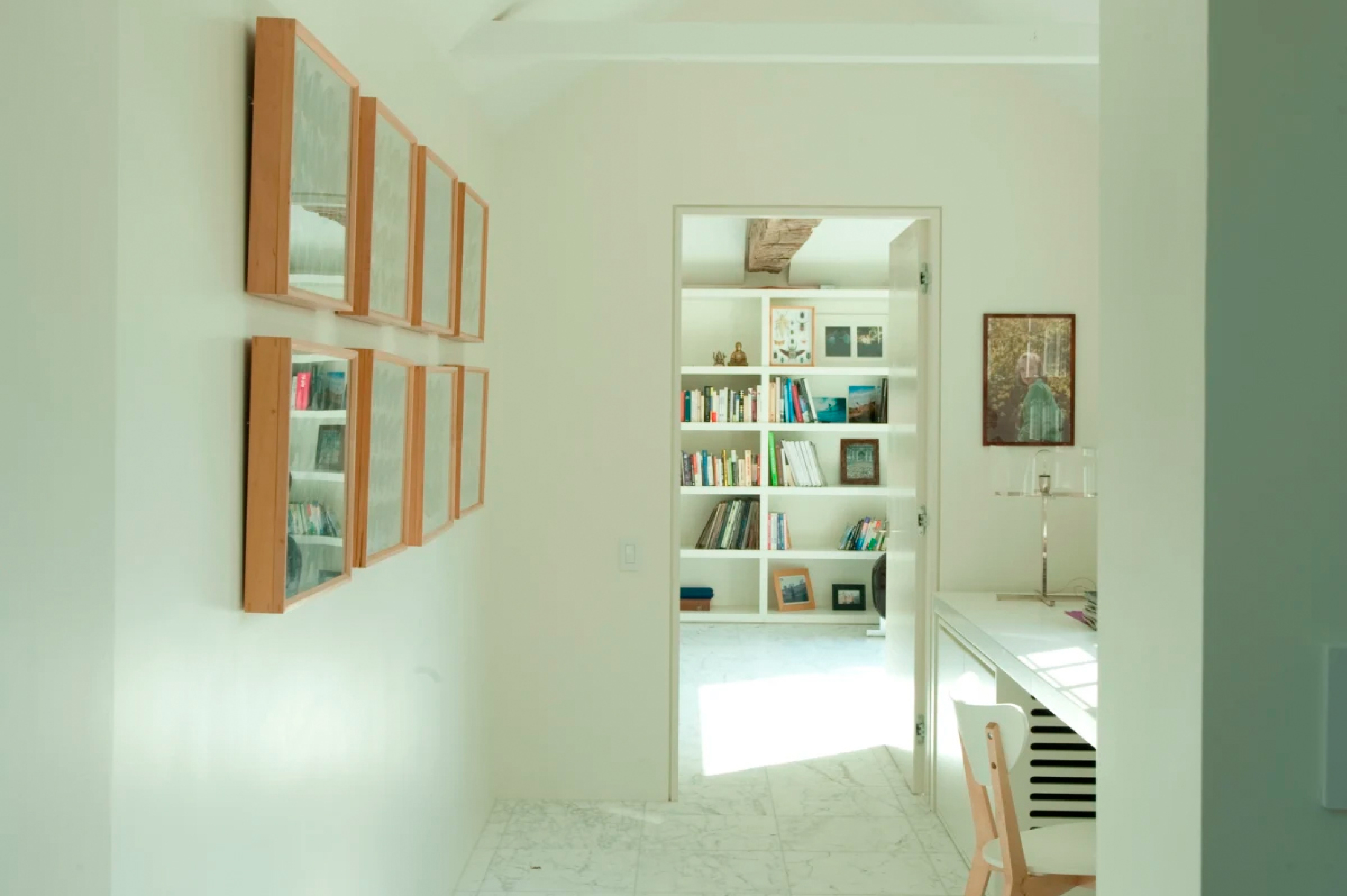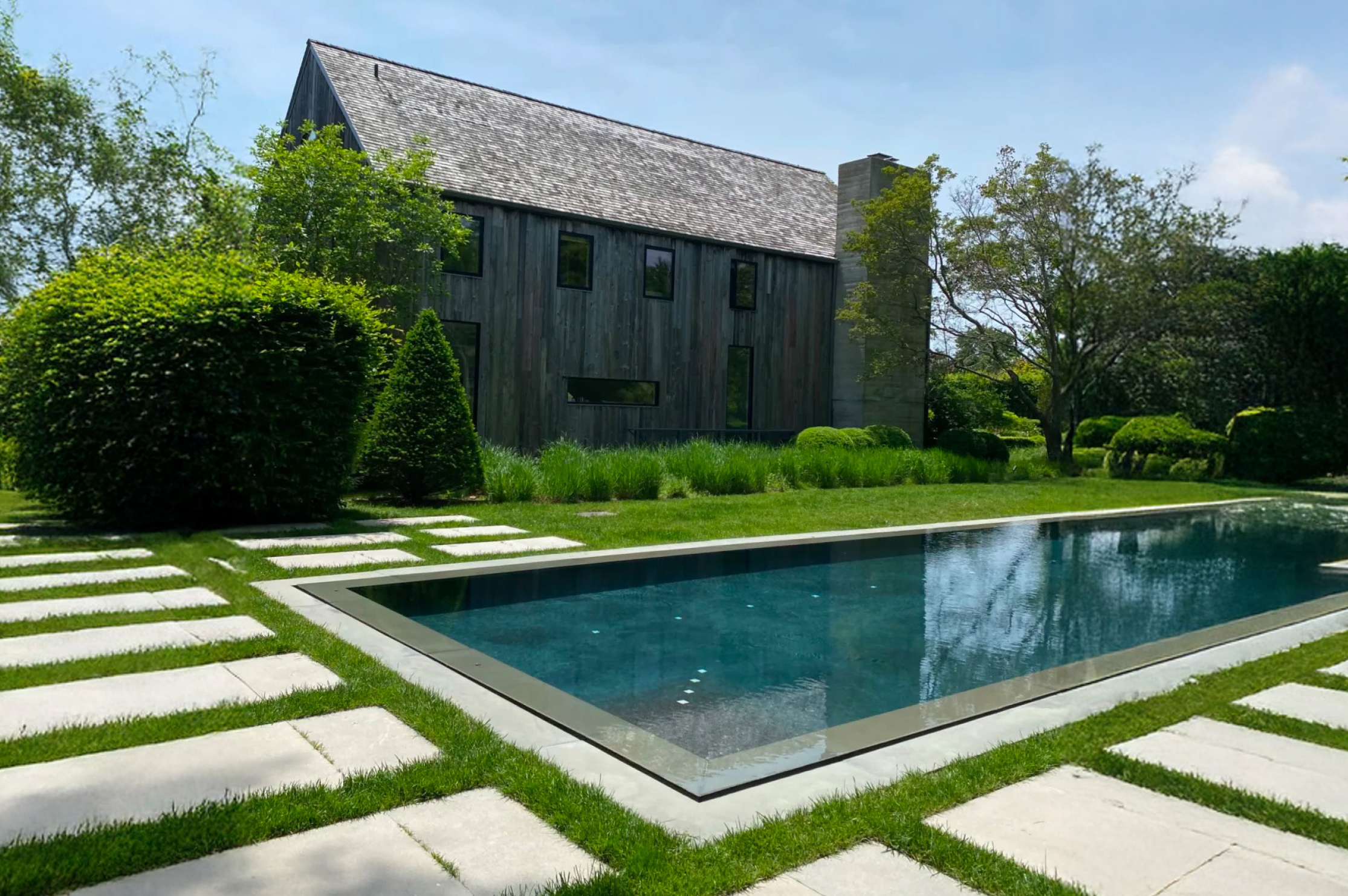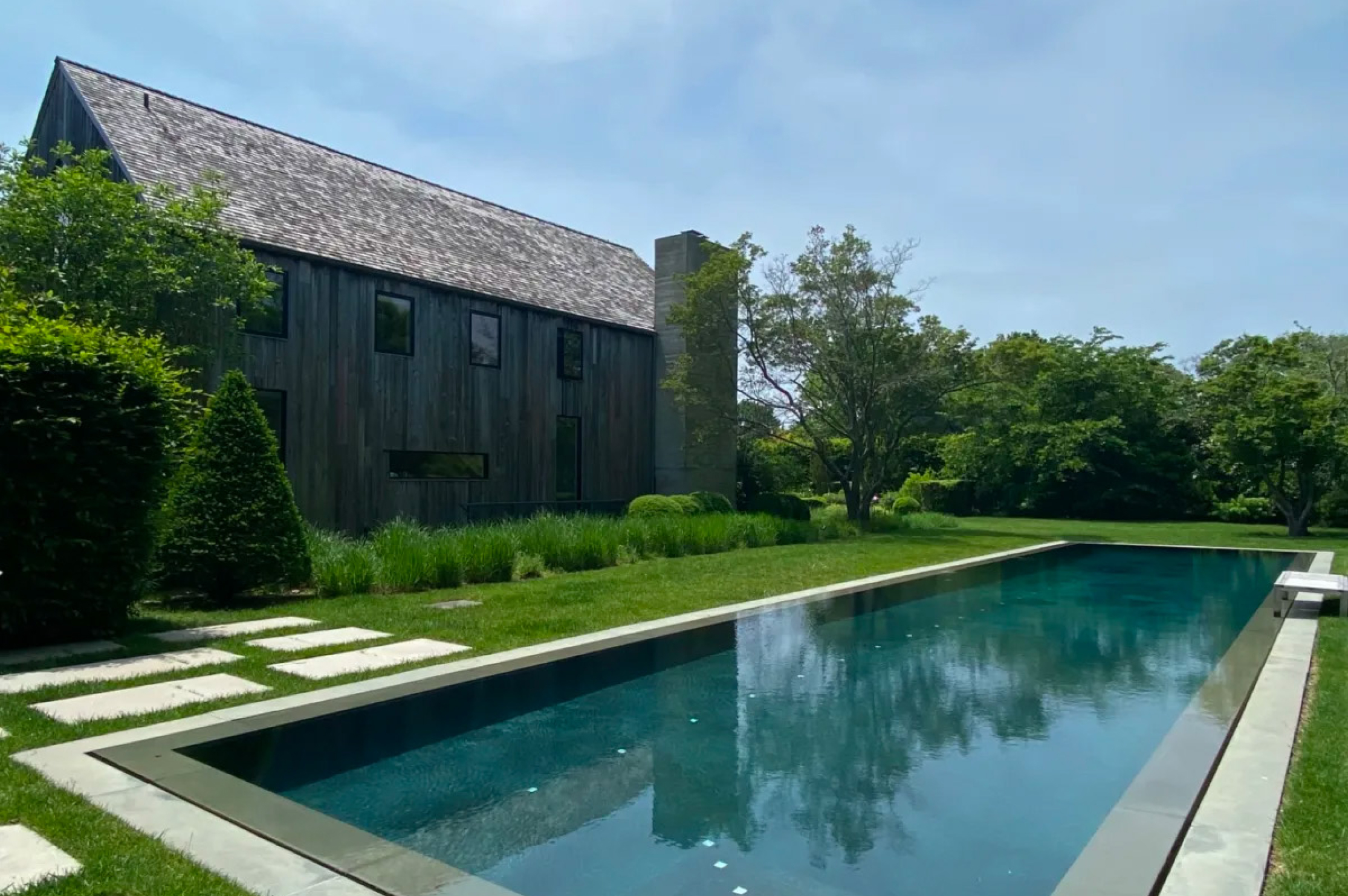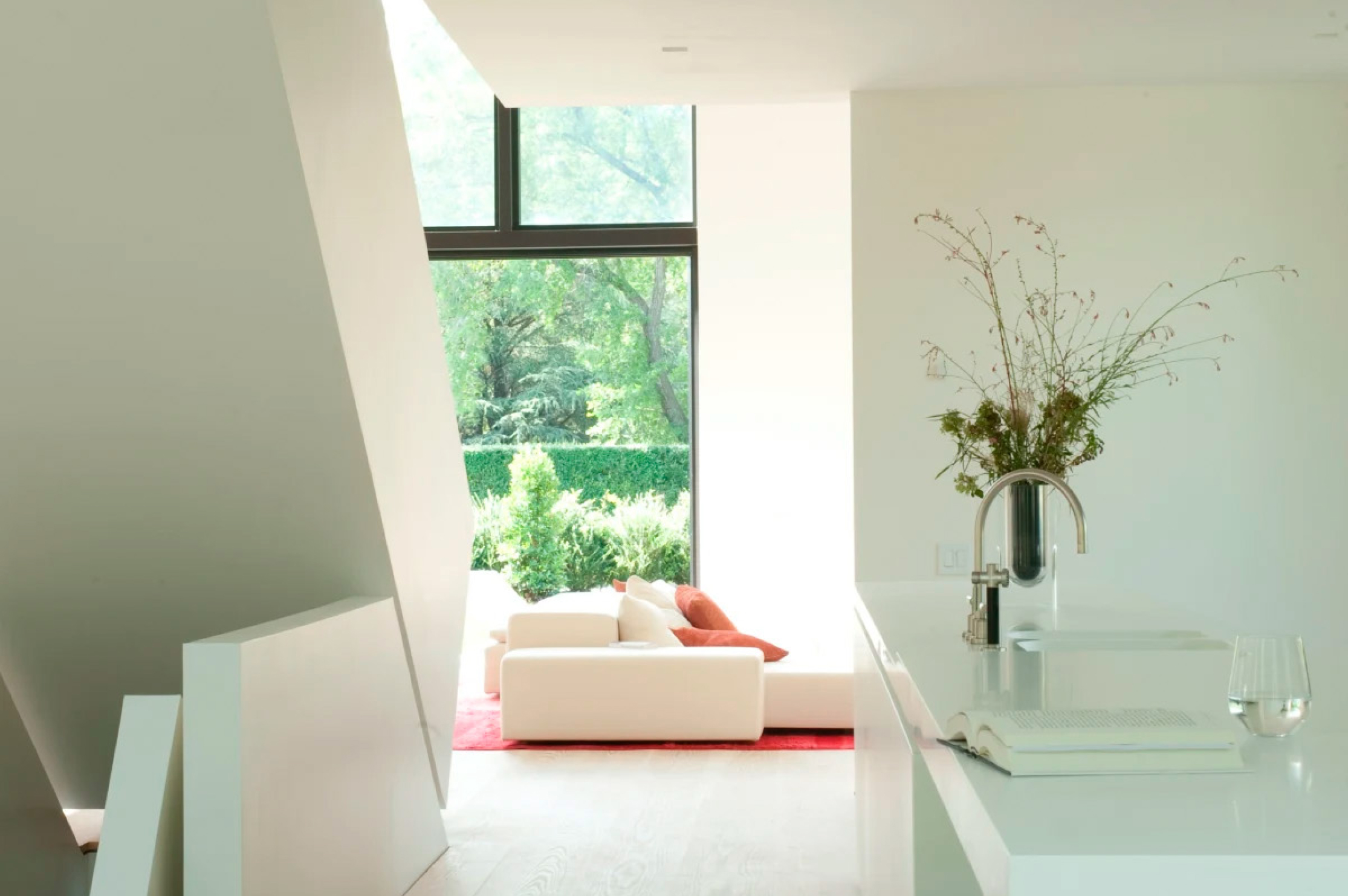 This property beautifully integrates a strong connection to nature with an open floor plan, highlighted by a striking central staircase that exudes a minimalist, almost monastic vibe. To enhance the character of the 1980s faux barn, D’Haene replaced sections of standard cedar siding with reclaimed planks from a 200-year-old barn, adding a sense of history and charm. The original cedar remains on a smaller structure that connects to the expanded garage, which now features a combined yoga studio and media room at the front, along with two parking spaces at the back.
