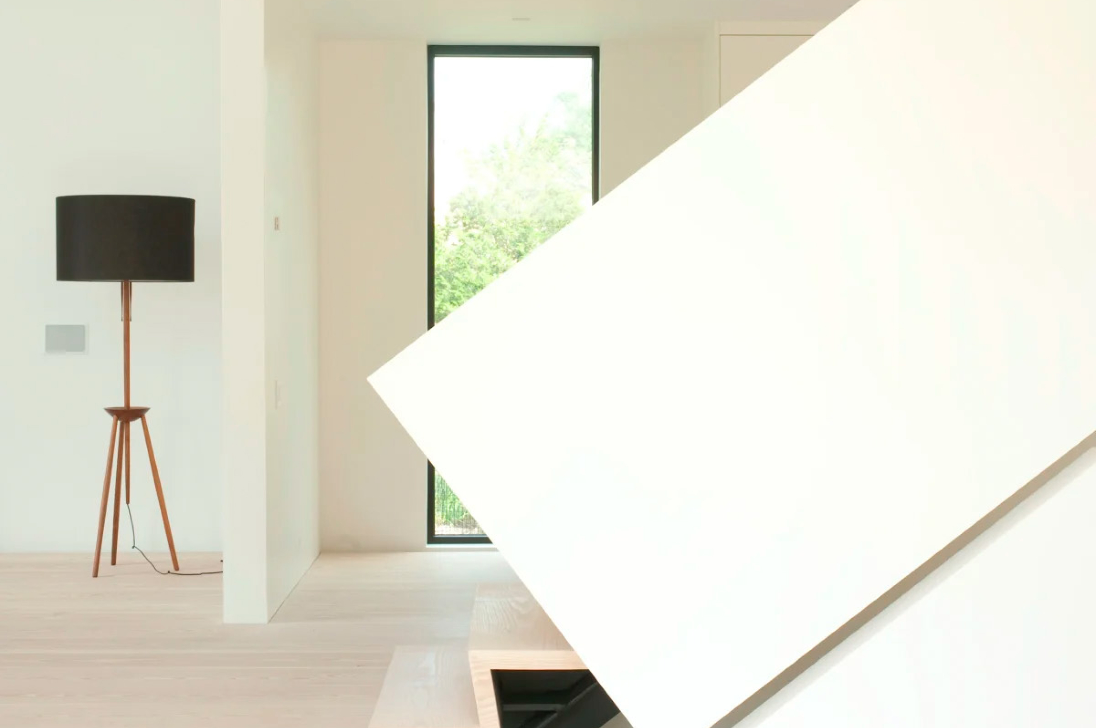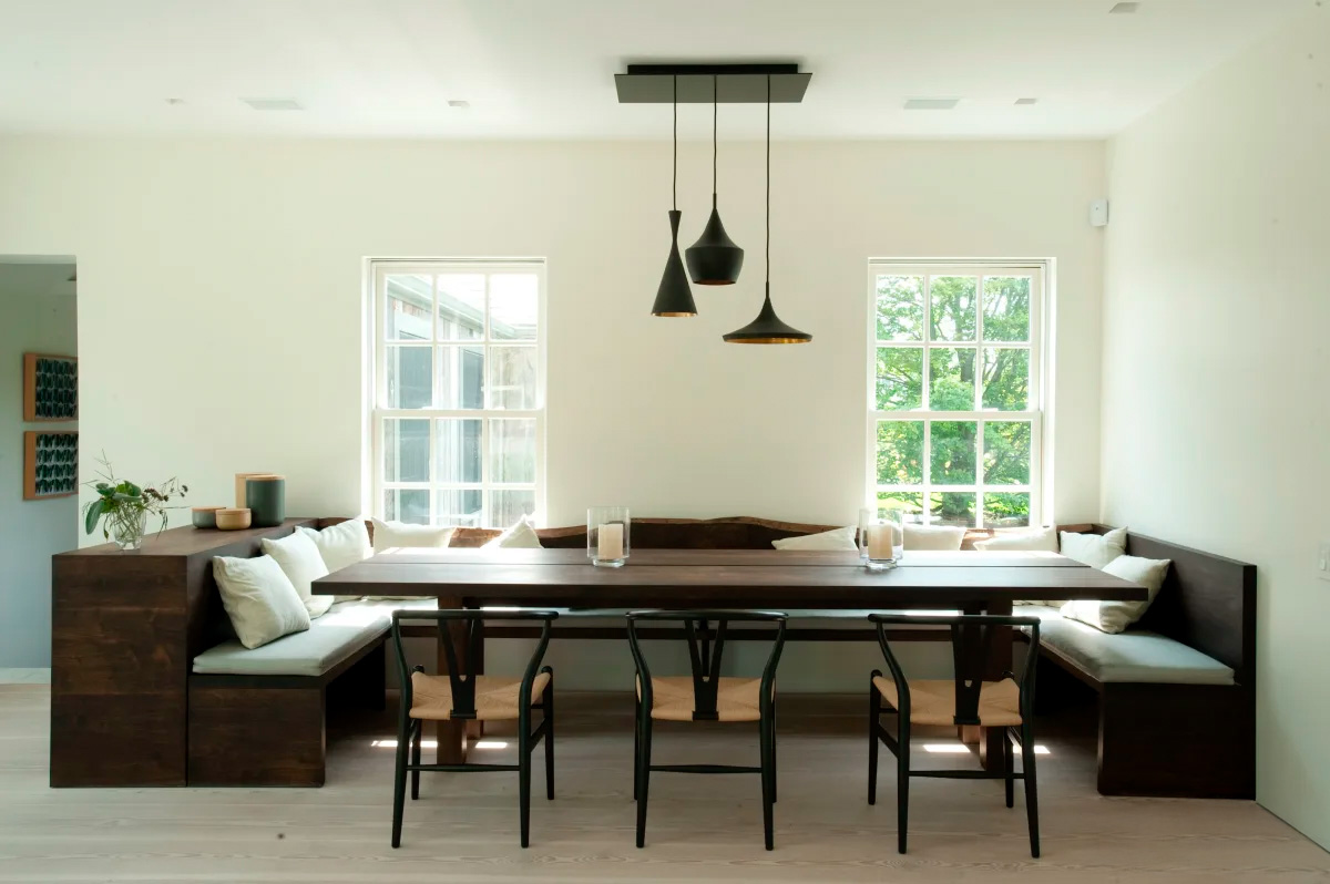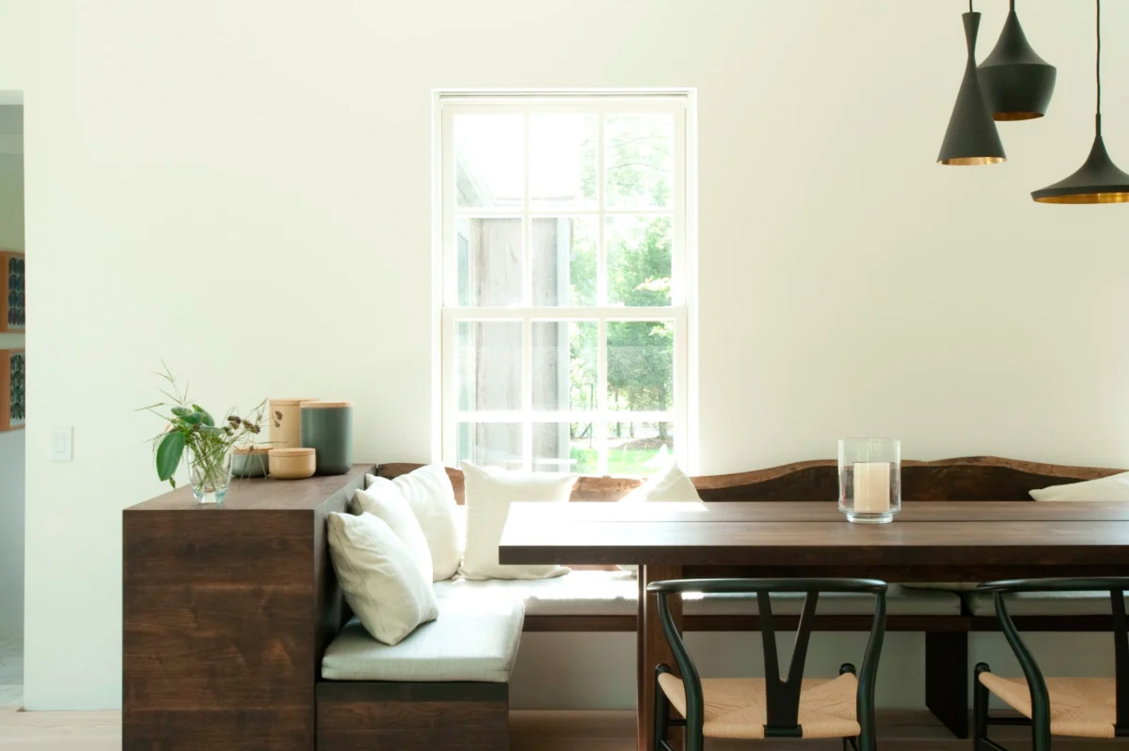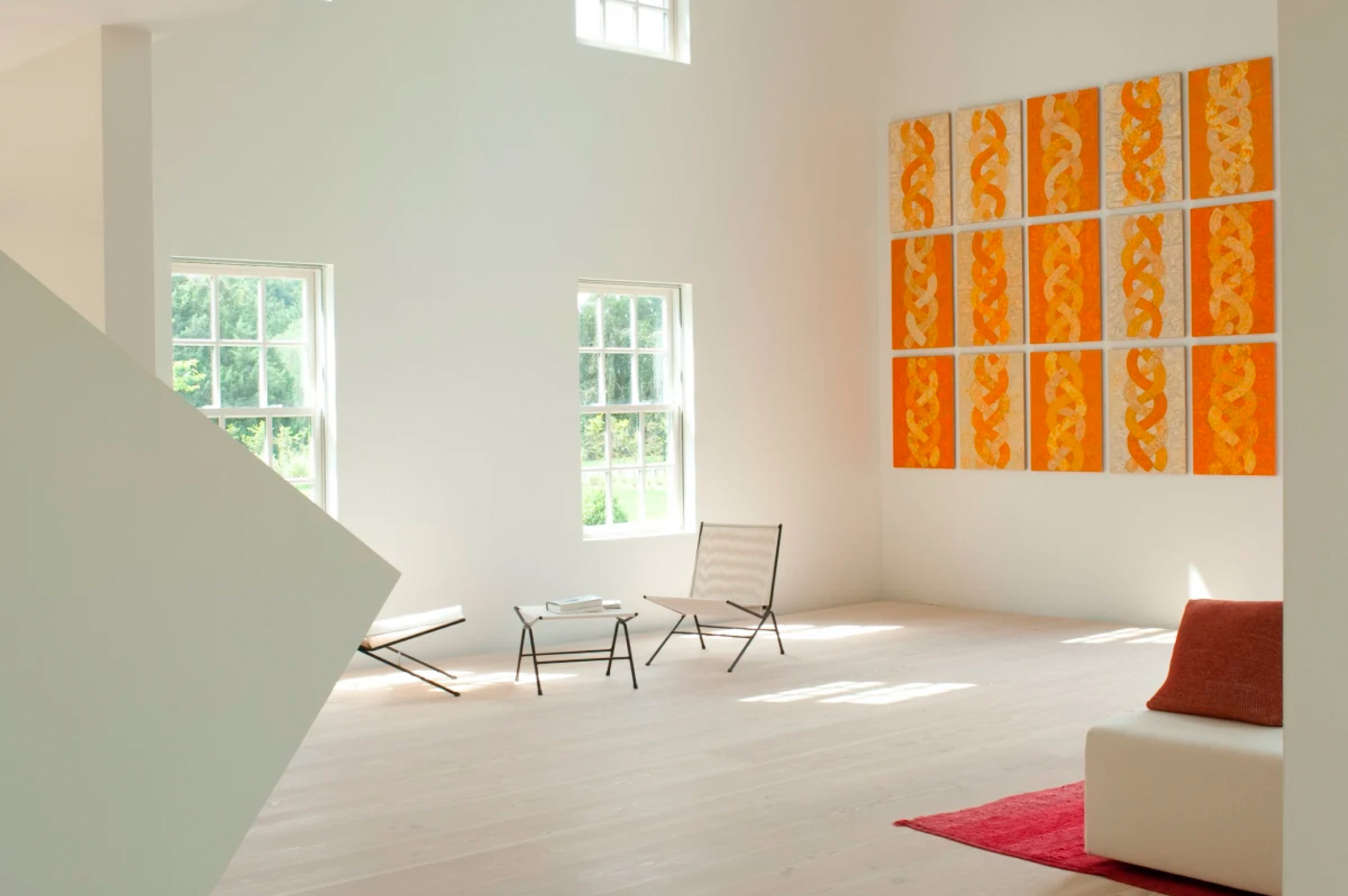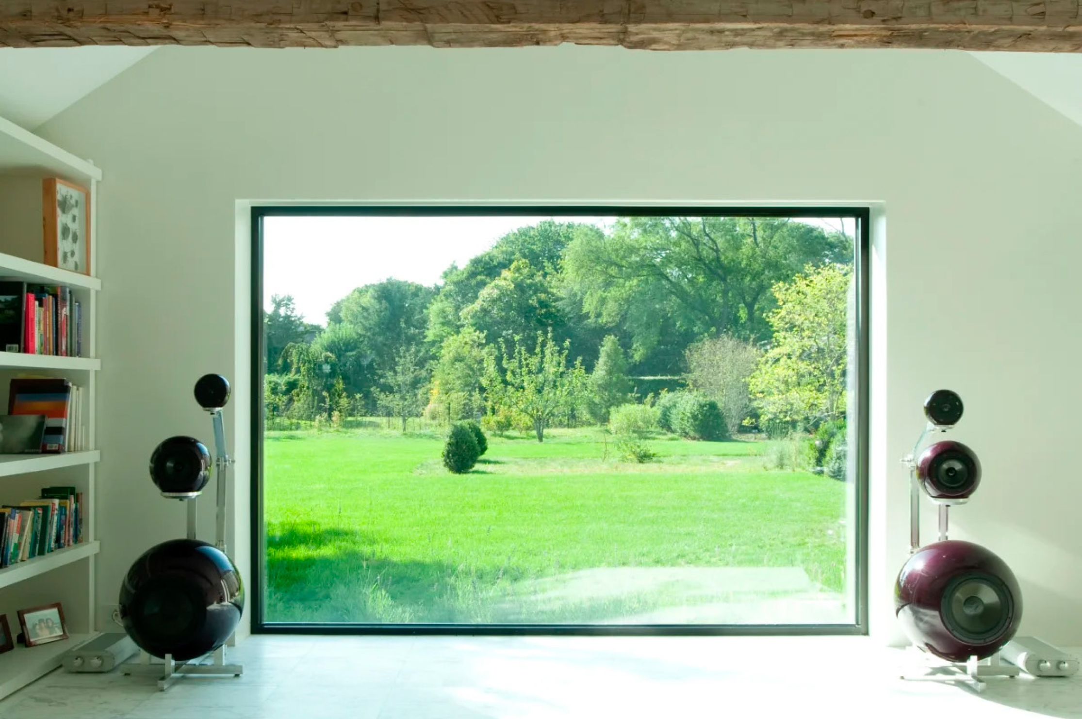 This property beautifully integrates a strong connection to nature with an open floor plan, highlighted by a striking central staircase that exudes a minimalist, almost monastic vibe. To enhance the character of the 1980s faux barn, D’Haene replaced sections of standard cedar siding with reclaimed planks from a 200-year-old barn, adding a sense of history and charm. The original cedar remains on a smaller structure that connects to the expanded garage, which now features a combined yoga studio and media room at the front, along with two parking spaces at the back.