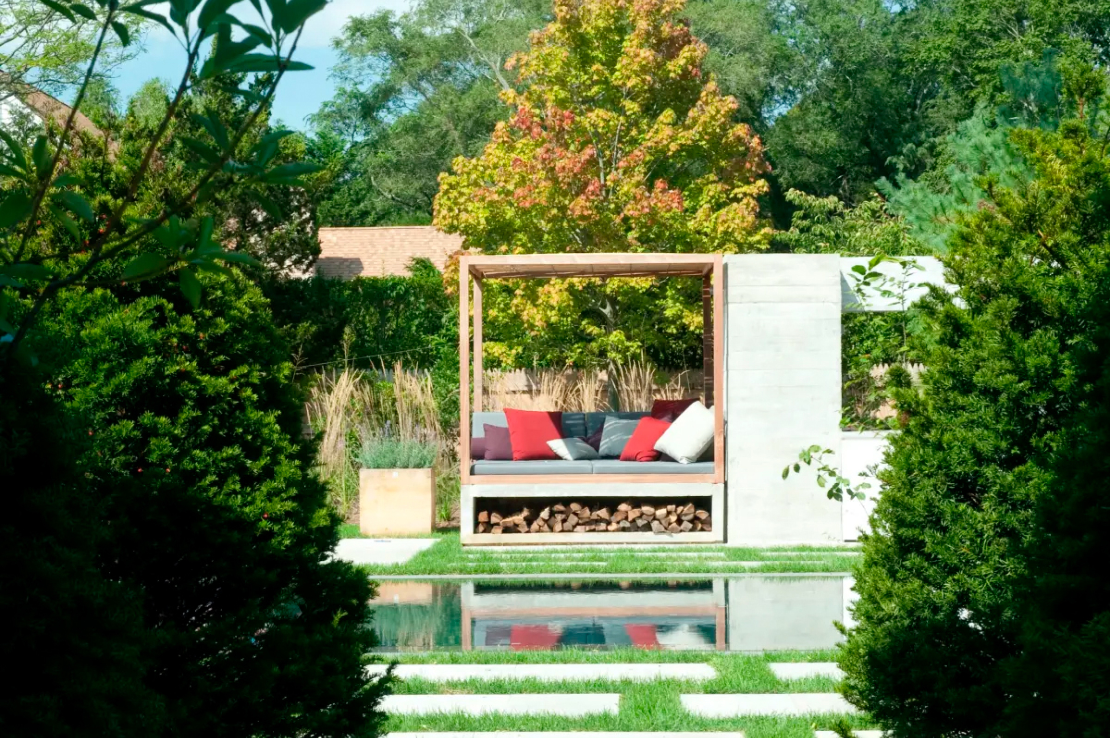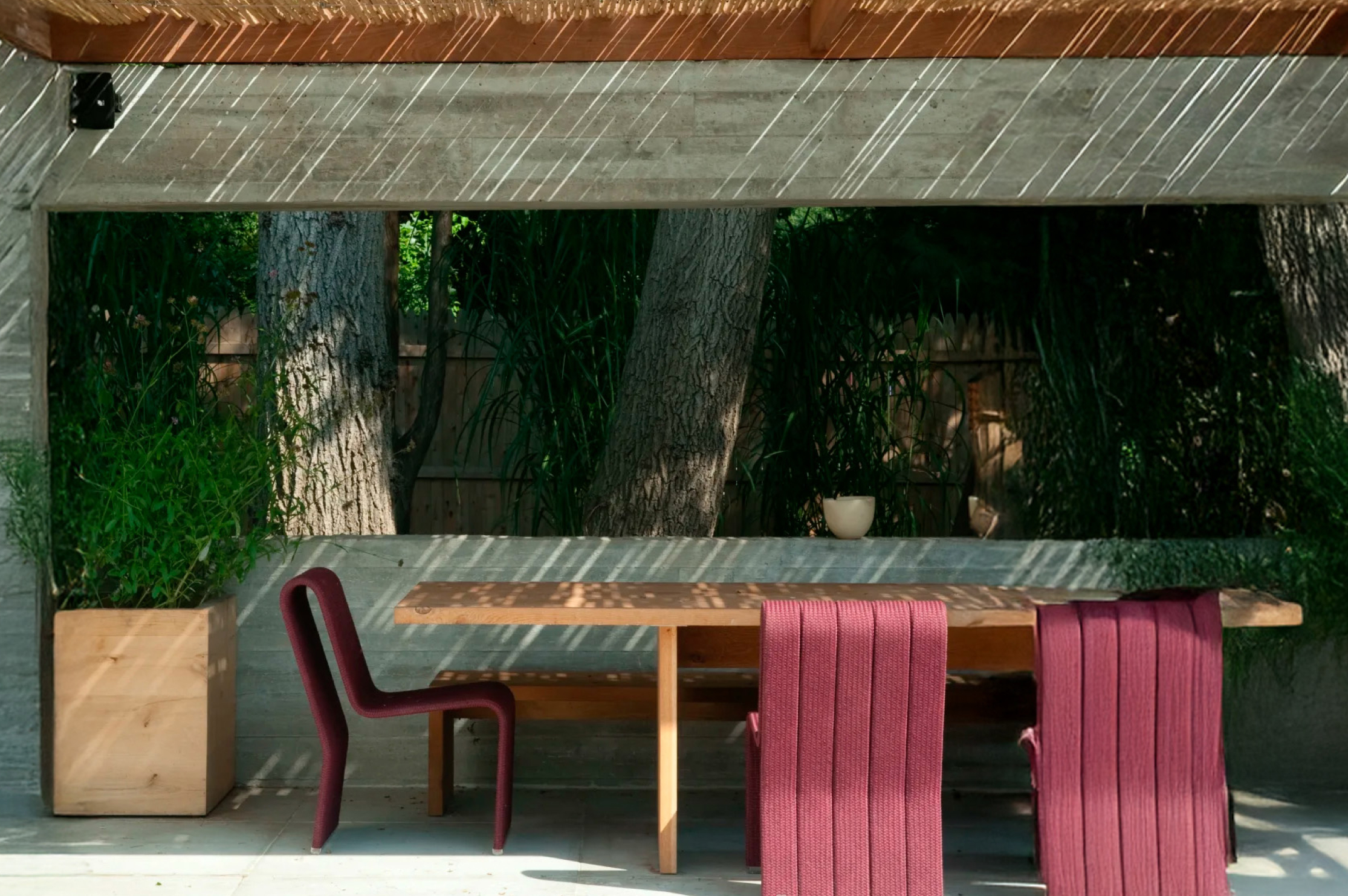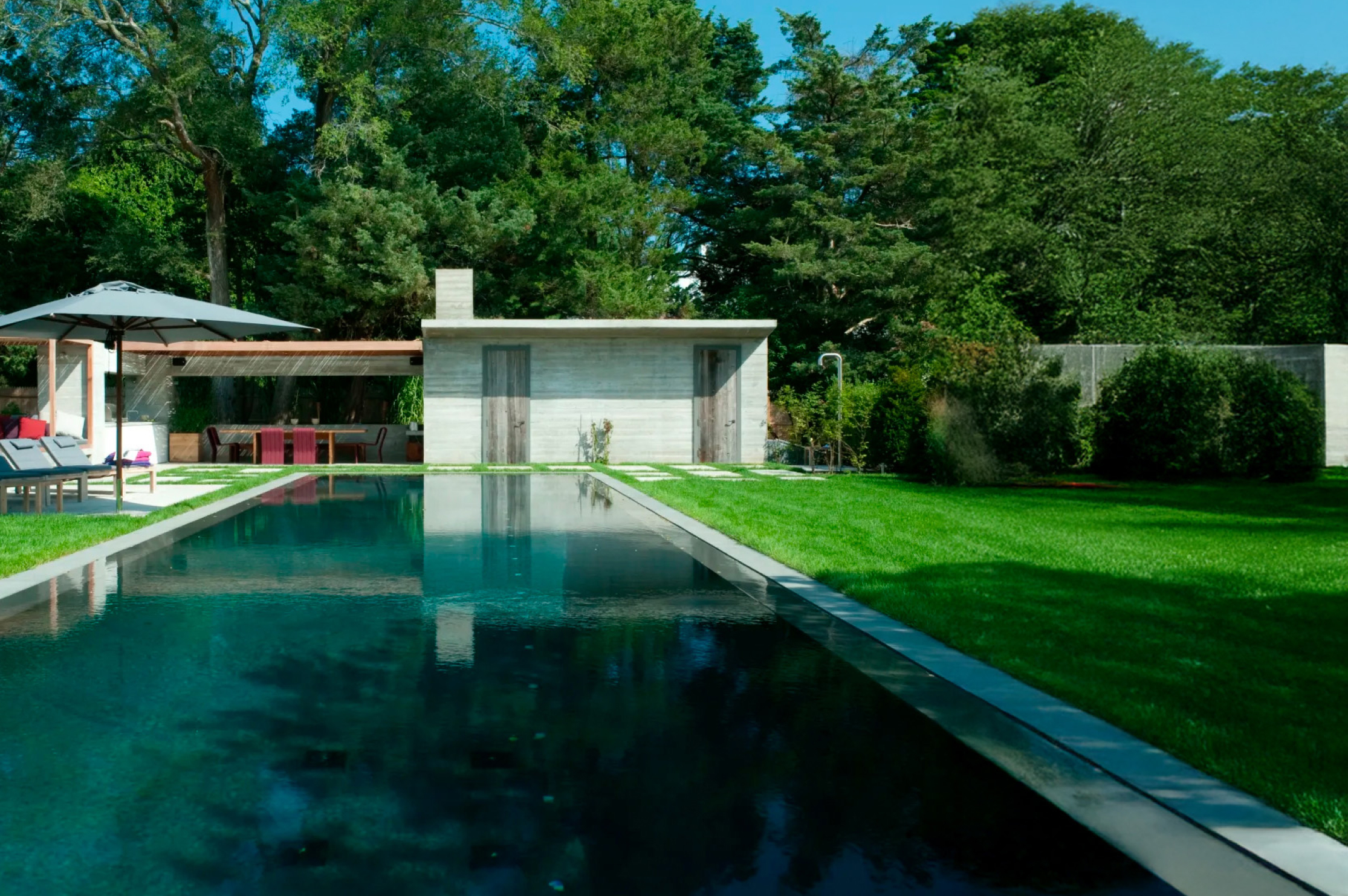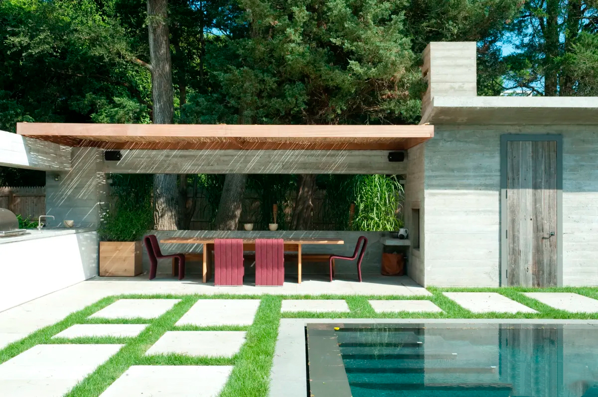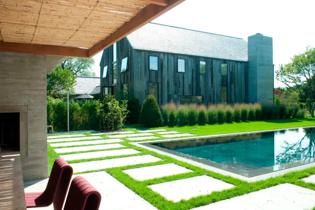 The division of functions is thoughtfully reflected in the facade, showcasing a harmonious blend of materials: one half clad in cedar and the other in concrete patterned with horizontal formwork. This design not only mirrors but also contrasts with the barn’s silvery vertical lines, creating a visually engaging aesthetic that celebrates both the rustic and the contemporary.