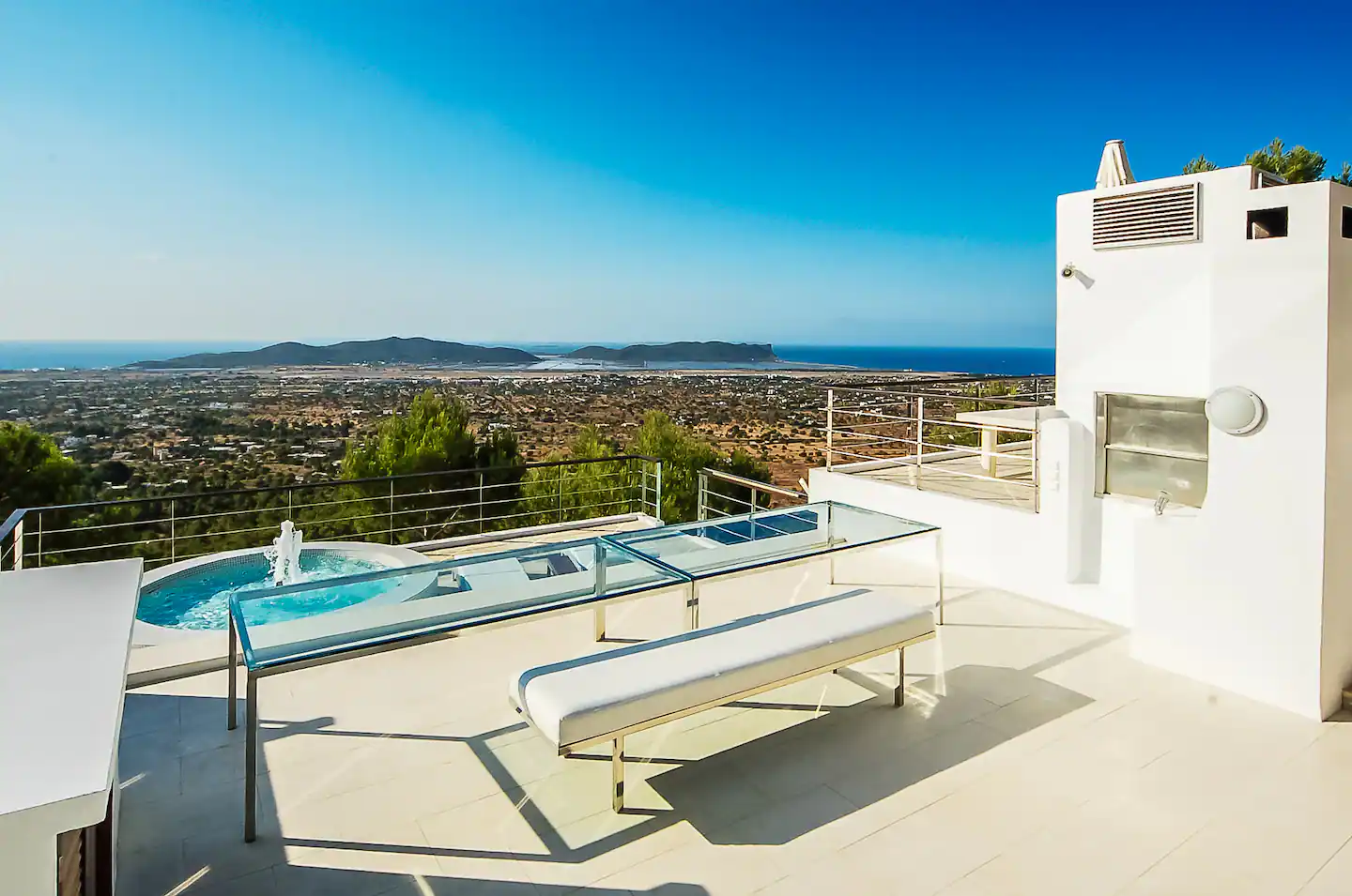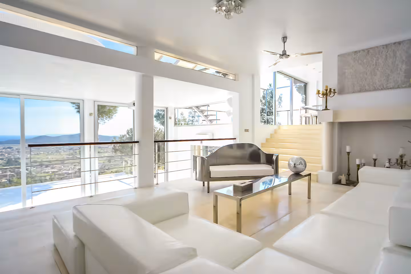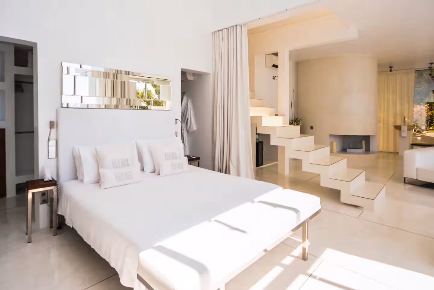 Featuring breathtaking 180º panoramic views of Ibiza Old Town, Salinas beaches, Es Codolar, and the island of Formentera, the scenery is nothing short of spectacular. Outdoor amenities include an expansive 32-meter (105 ft.) pool with waterfalls, a hidden cave, a floating cabana, and unique sub-aquatic pool windows, along with two hydro massage spa baths for ultimate relaxation. Additional features include an infrared detox sauna, a poolside bar with a dedicated barman, and an outdoor dining area complete with a barbecue. Villa Roca is a destination that truly must be experienced to be believed, as words alone can hardly capture its magnificence.