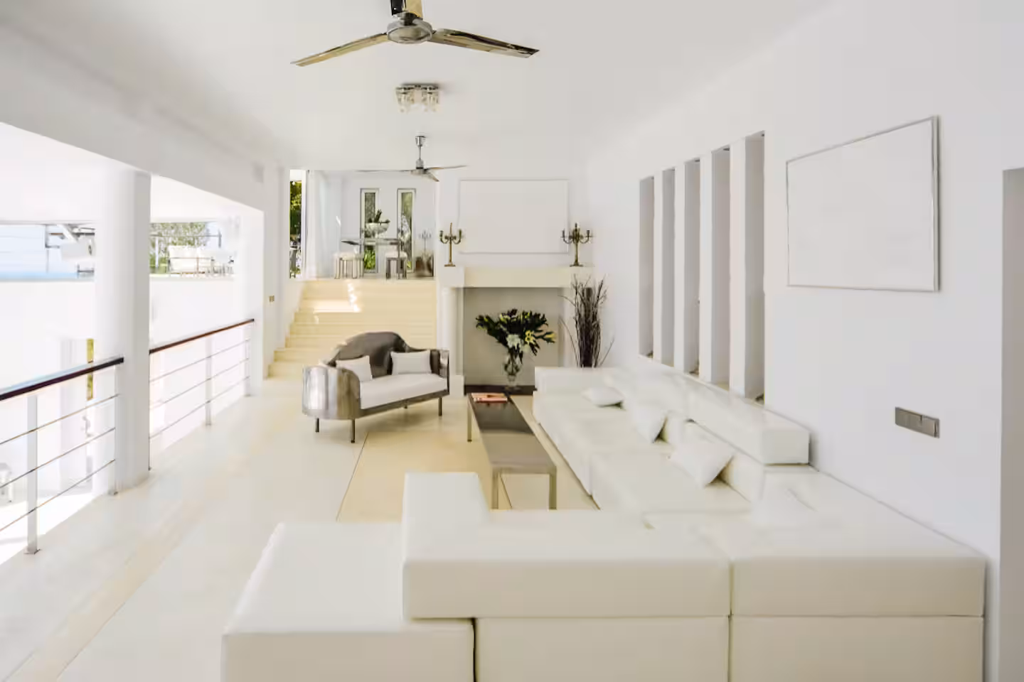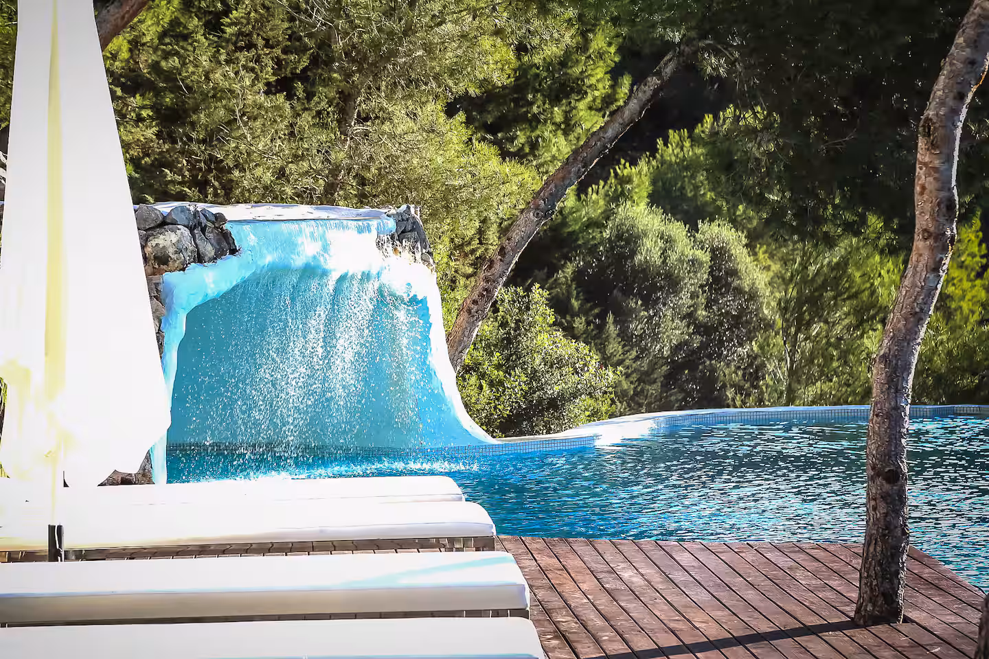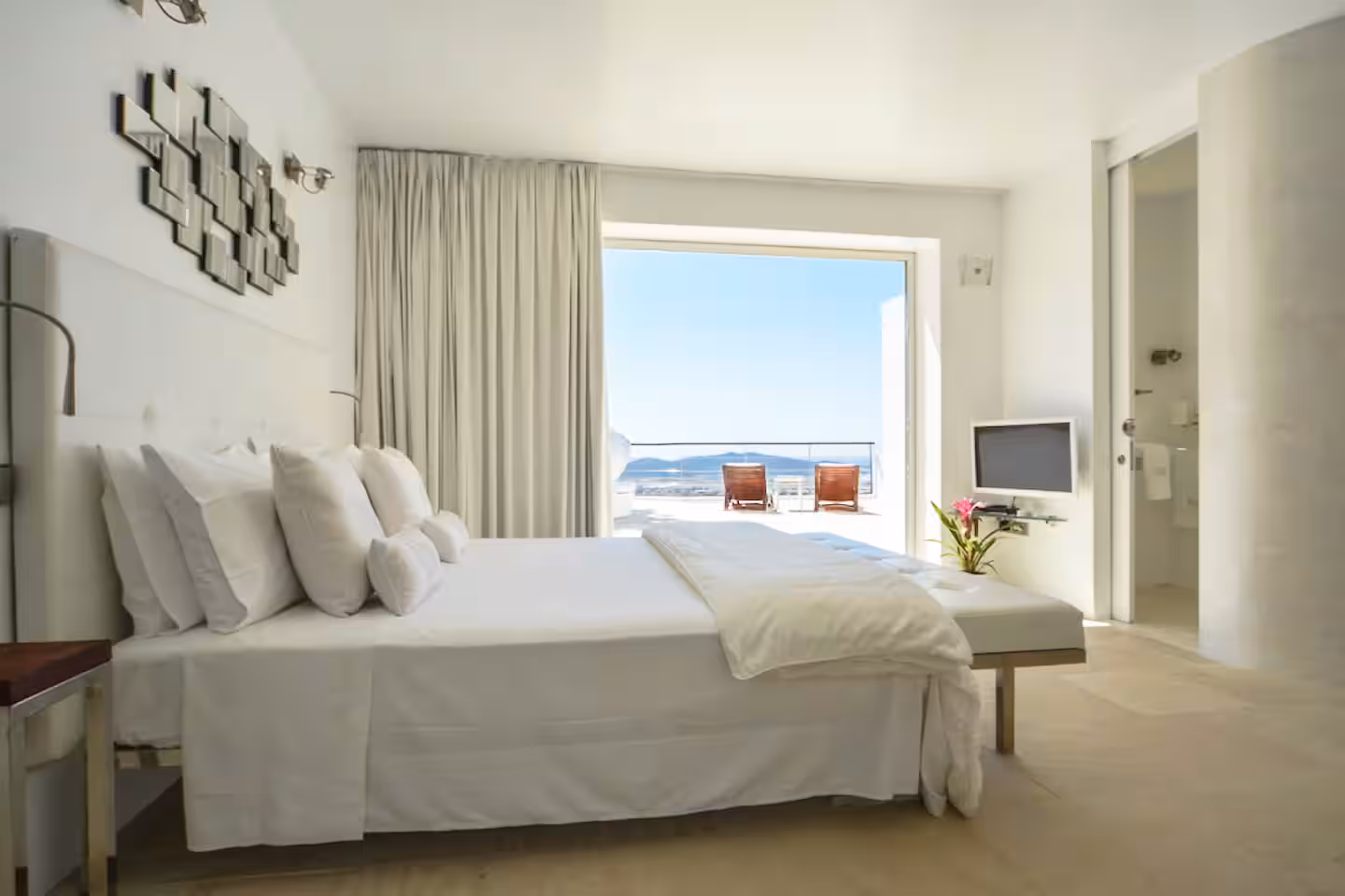 Featuring breathtaking 180º panoramic views of Ibiza Old Town, Salinas beaches, Es Codolar, and the island of Formentera, the scenery is nothing short of spectacular. Outdoor amenities include an expansive 32-meter (105 ft.) pool with waterfalls, a hidden cave, a floating cabana, and unique sub-aquatic pool windows, along with two hydro massage spa baths for ultimate relaxation. Additional features include an infrared detox sauna, a poolside bar with a dedicated barman, and an outdoor dining area complete with a barbecue. Villa Roca is a destination that truly must be experienced to be believed, as words alone can hardly capture its magnificence.