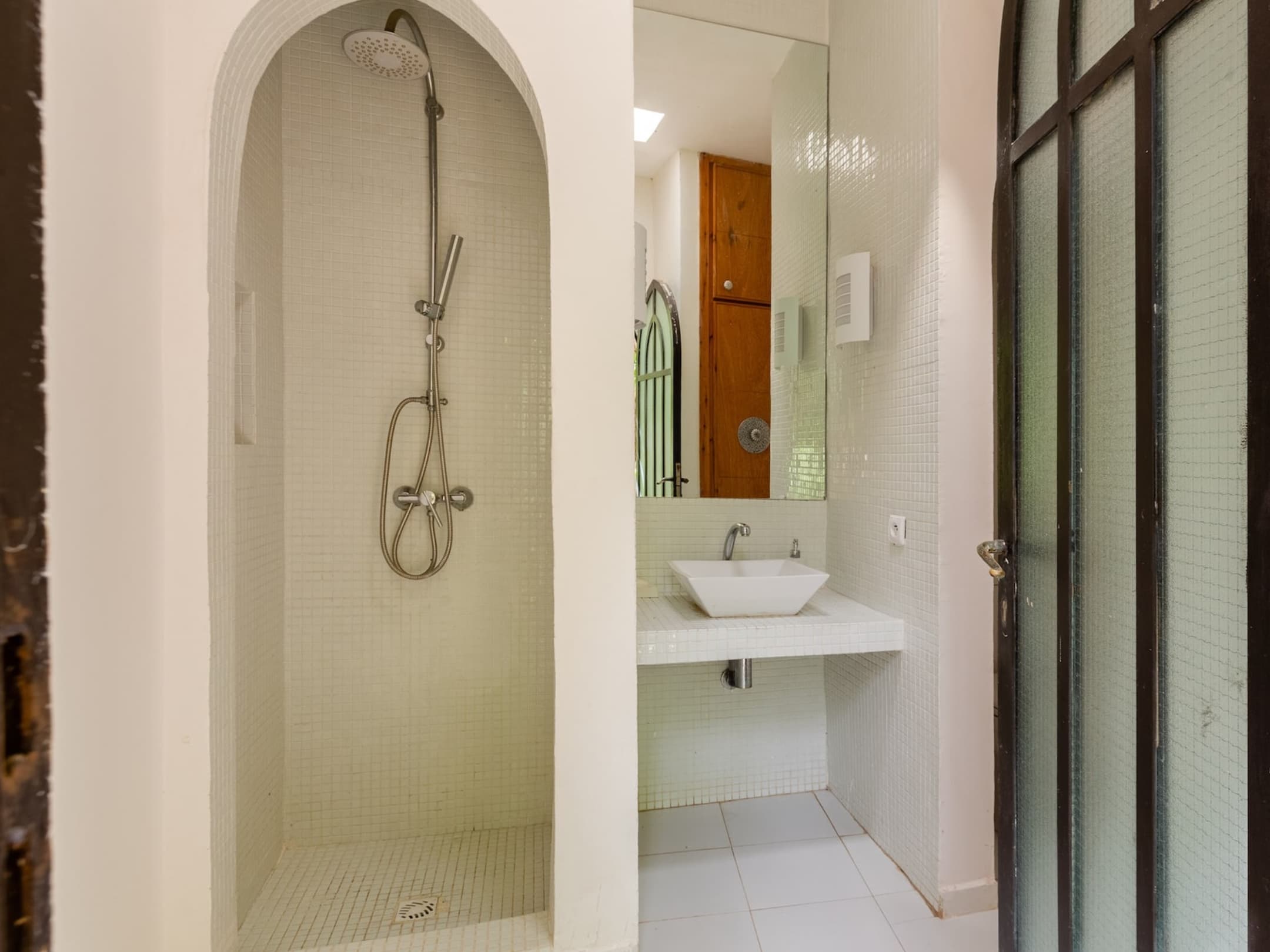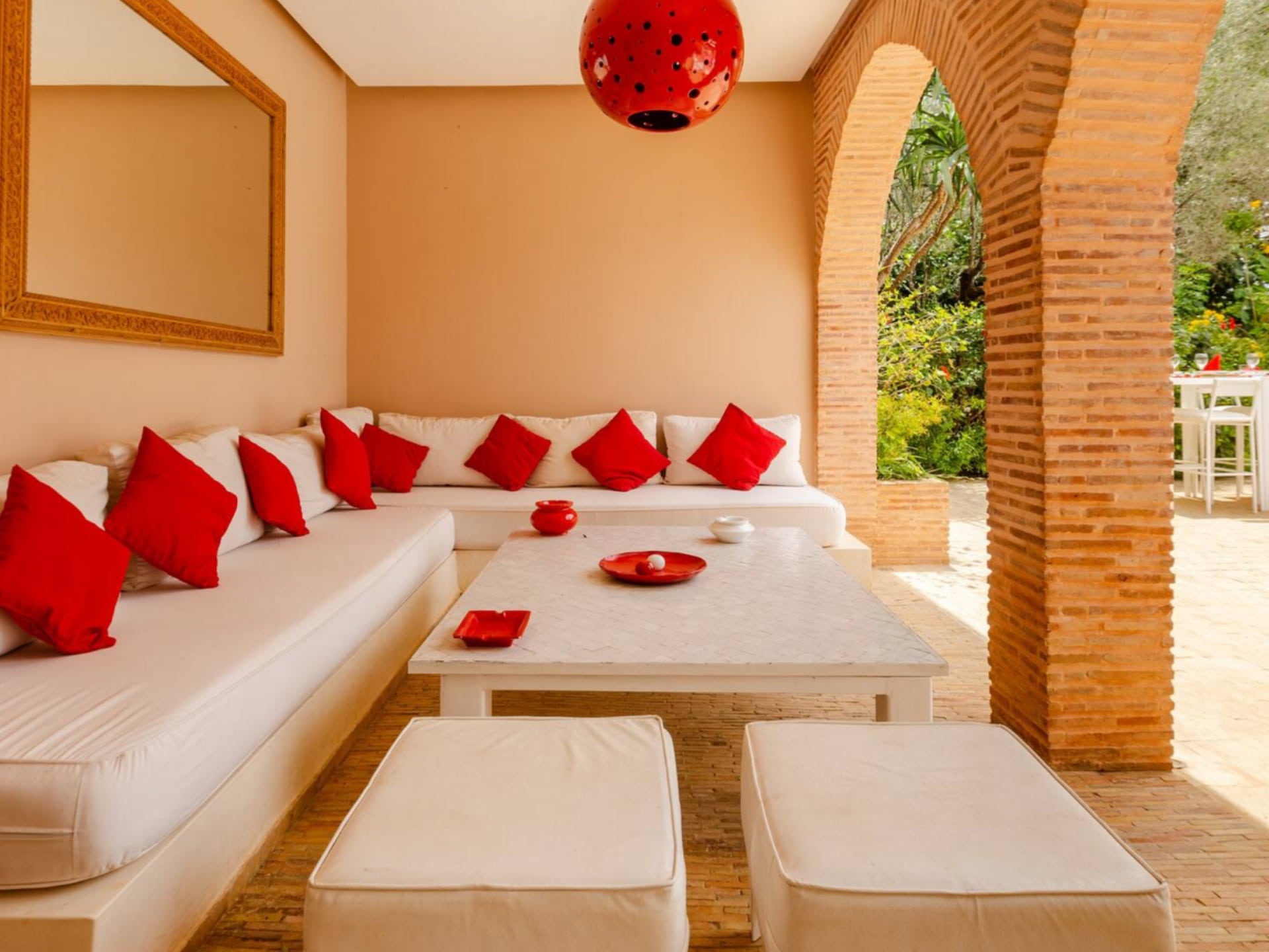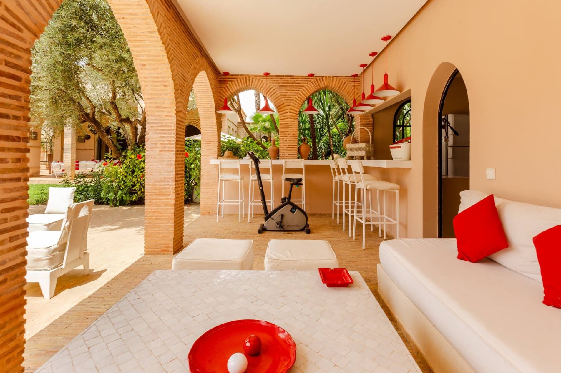 Stunning retreat that beautifully blends local and contemporary architecture, creating an inviting ambiance characterized by soft, natural hues. The villa is tastefully decorated with simplicity and elegance, ensuring a serene atmosphere perfect for relaxation and comfort. At the heart of the property lies a charming patio adorned with red brick arches, seamlessly connecting the indoor spaces to the lush garden that surrounds it.