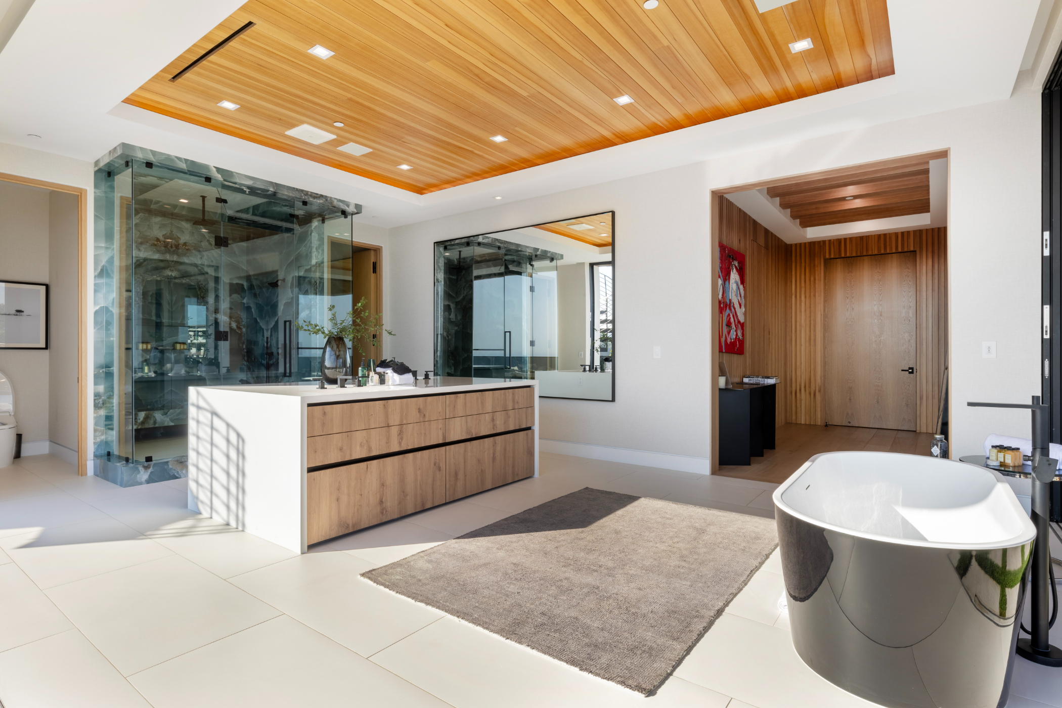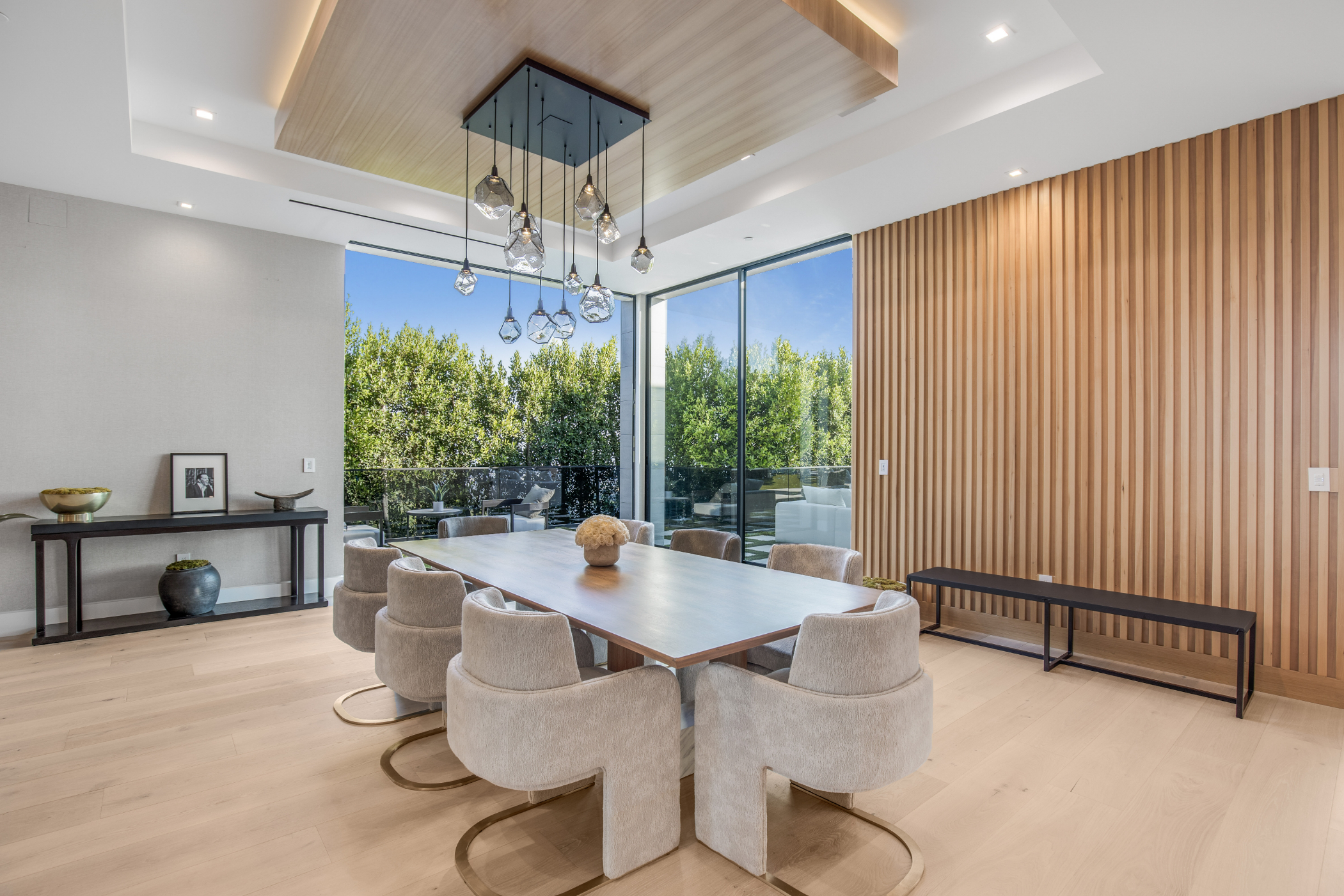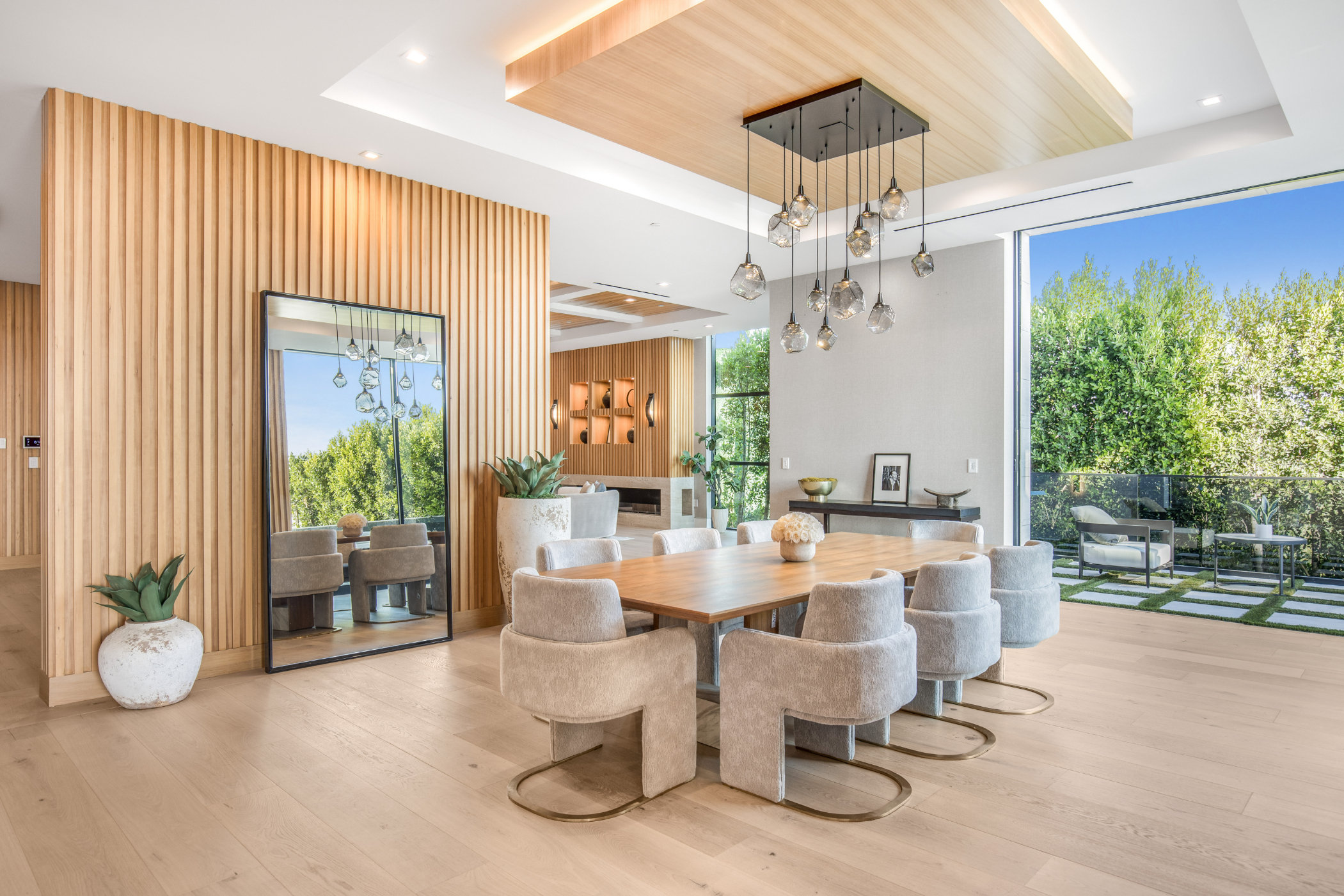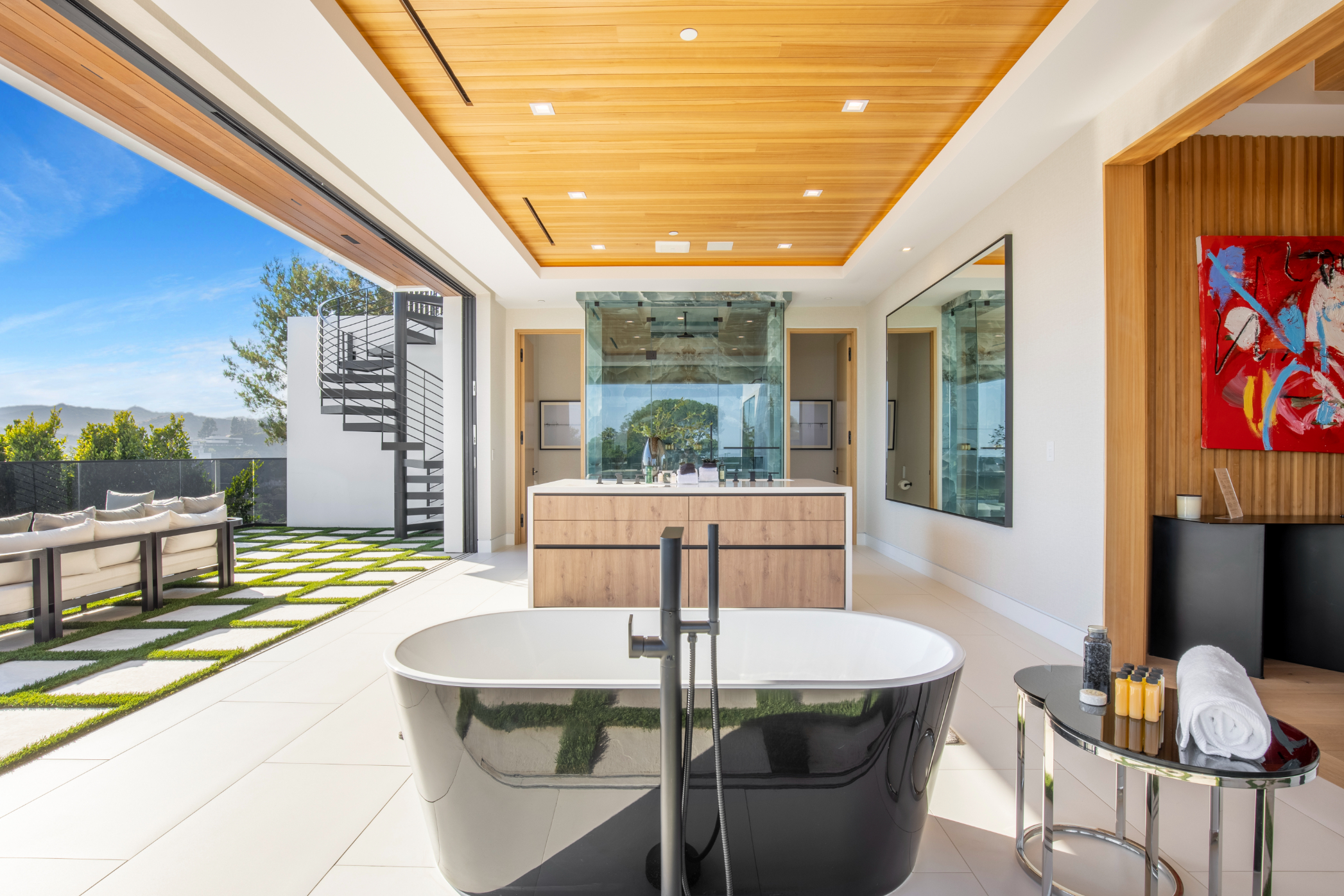 Step into Bel-Air Paradise, a stunning modern estate crafted by the renowned Ramtin Ray Nosrati. Located in one of Los Angeles’ most prestigious neighborhoods, this private sanctuary offers unparalleled security and tranquility, with a gated driveway and beautifully landscaped grounds. The impressive entryway, adorned with expansive glass walls, warm wood accents, and a lush living wall, introduces the home’s contemporary yet inviting design. Inside, soaring ceilings, exquisite finishes, and breathtaking ocean and city views create a seamless blend of indoor and outdoor living. The gourmet kitchen is a culinary masterpiece, boasting state-of-the-art appliances, a restaurant-style walk-in refrigerator, and an expansive central island. Designed for entertaining, the home also features a travertine-clad bar and an elegant wine room with a dedicated tasting area, epitomizing luxury and sophistication.