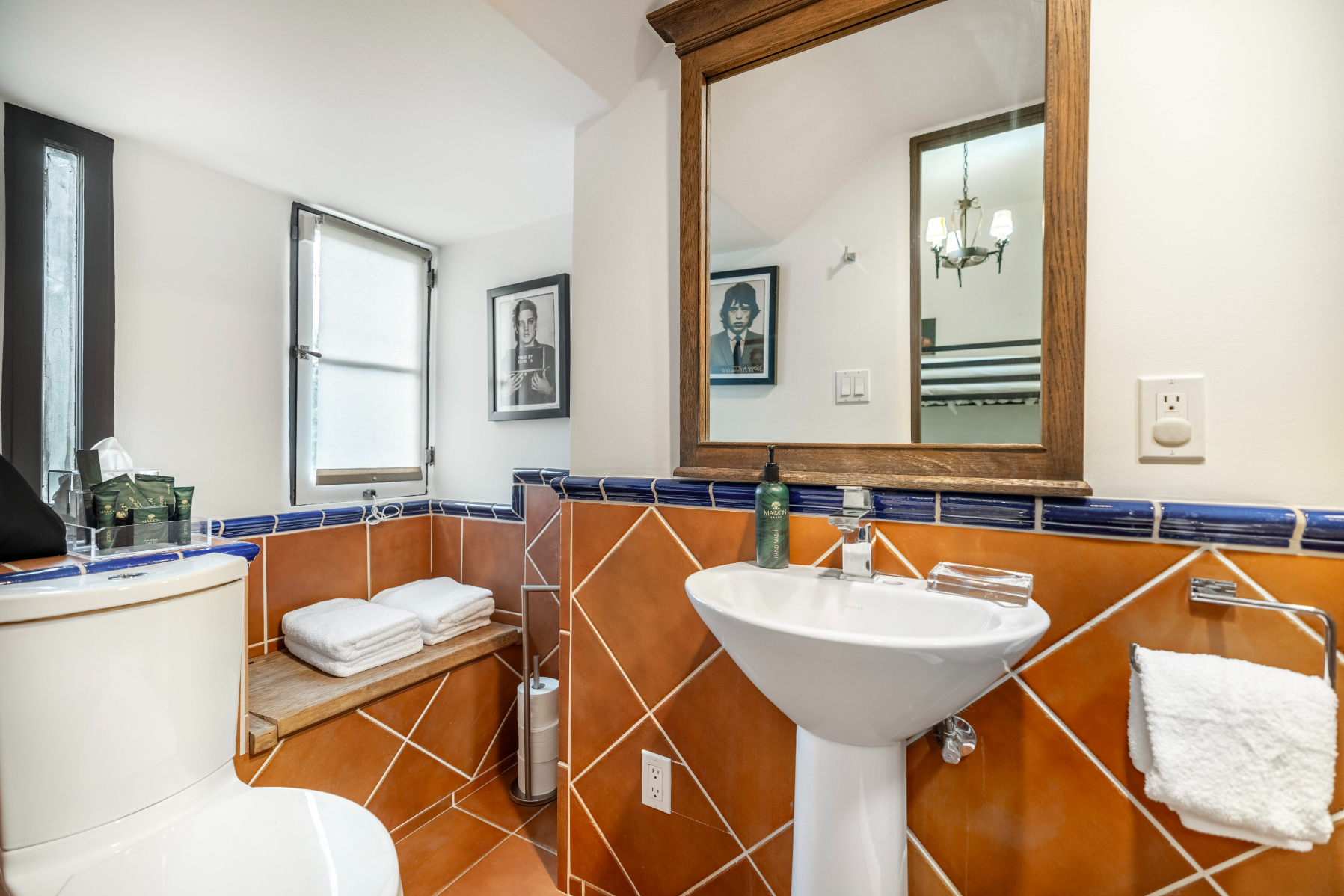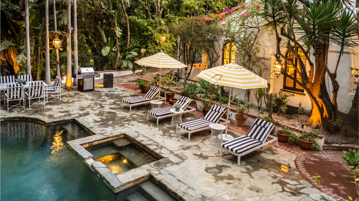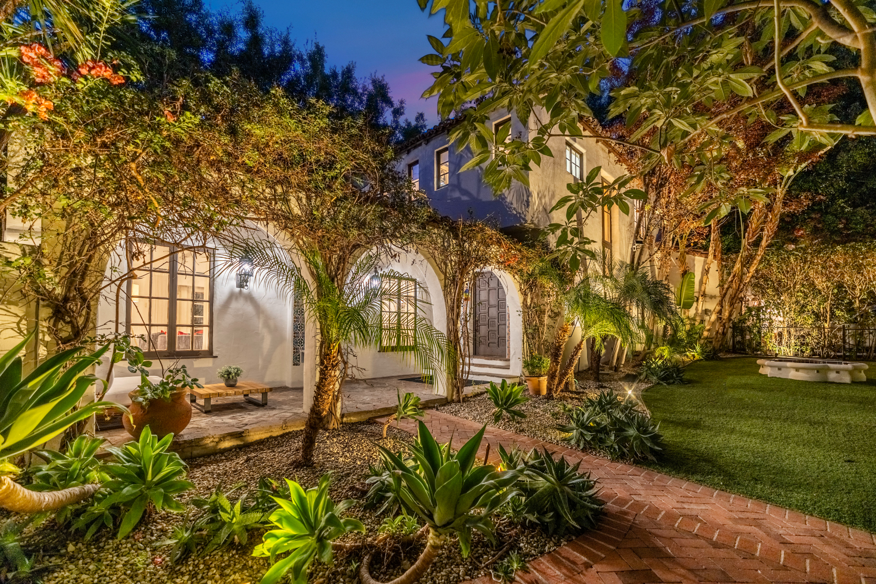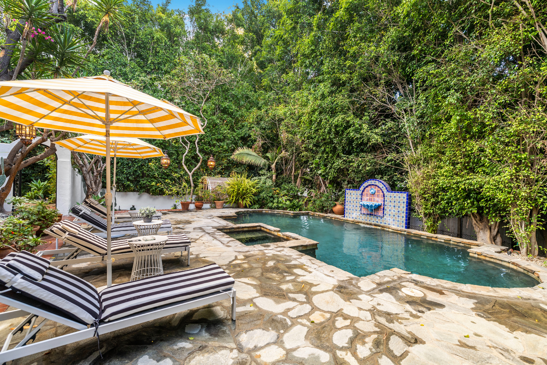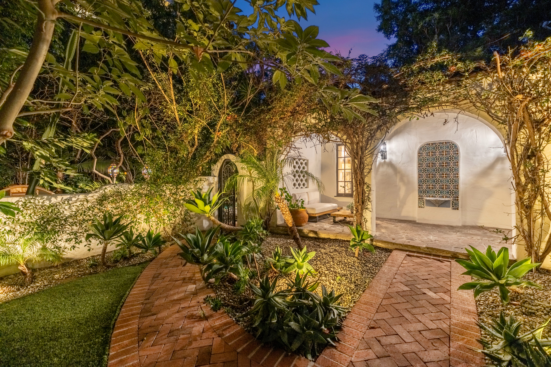 Walled and gated for ultimate seclusion, the expansive double lot bursts with mature agave, towering palms, and vibrant bougainvillea, creating an atmosphere of captivating privacy. A flagstone loggia welcomes you to a lush, secluded garden featuring an al fresco dining area reminiscent of the legendary Chateau Marmont.