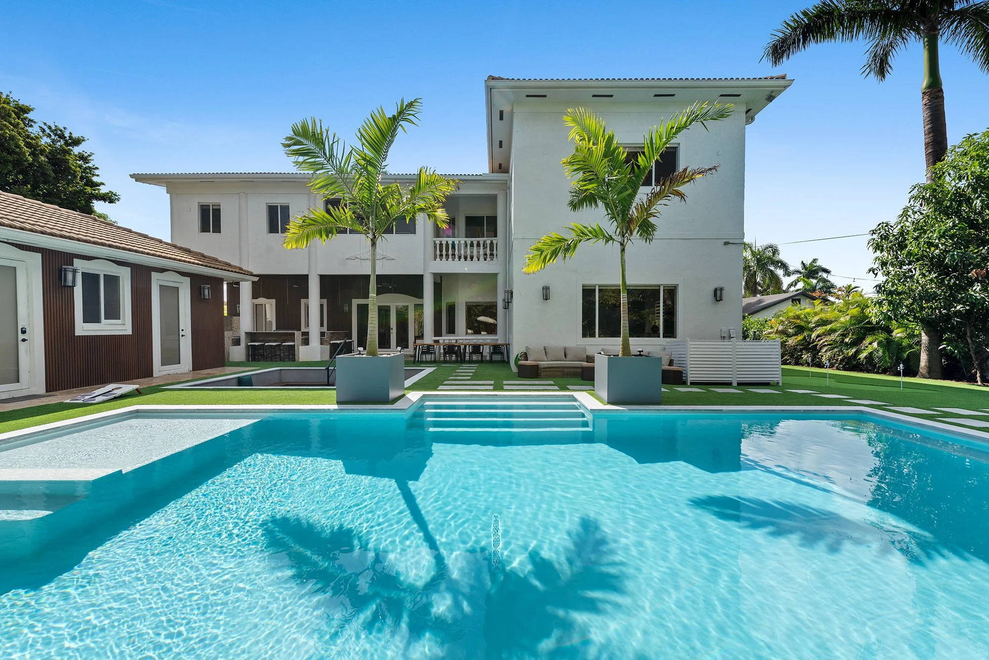Step outside to discover a tranquil koi pond, along with fun activities like badminton and mini golf. Gather around the contemporary sunken fire pit in the expansive backyard, perfect for memorable evenings. Combining a prime location with sophisticated design, The Tortuga Villa sets the stage for extraordinary celebrations and luxurious escapes — the ultimate Miami lifestyle where comfort seamlessly blends with grandeur.