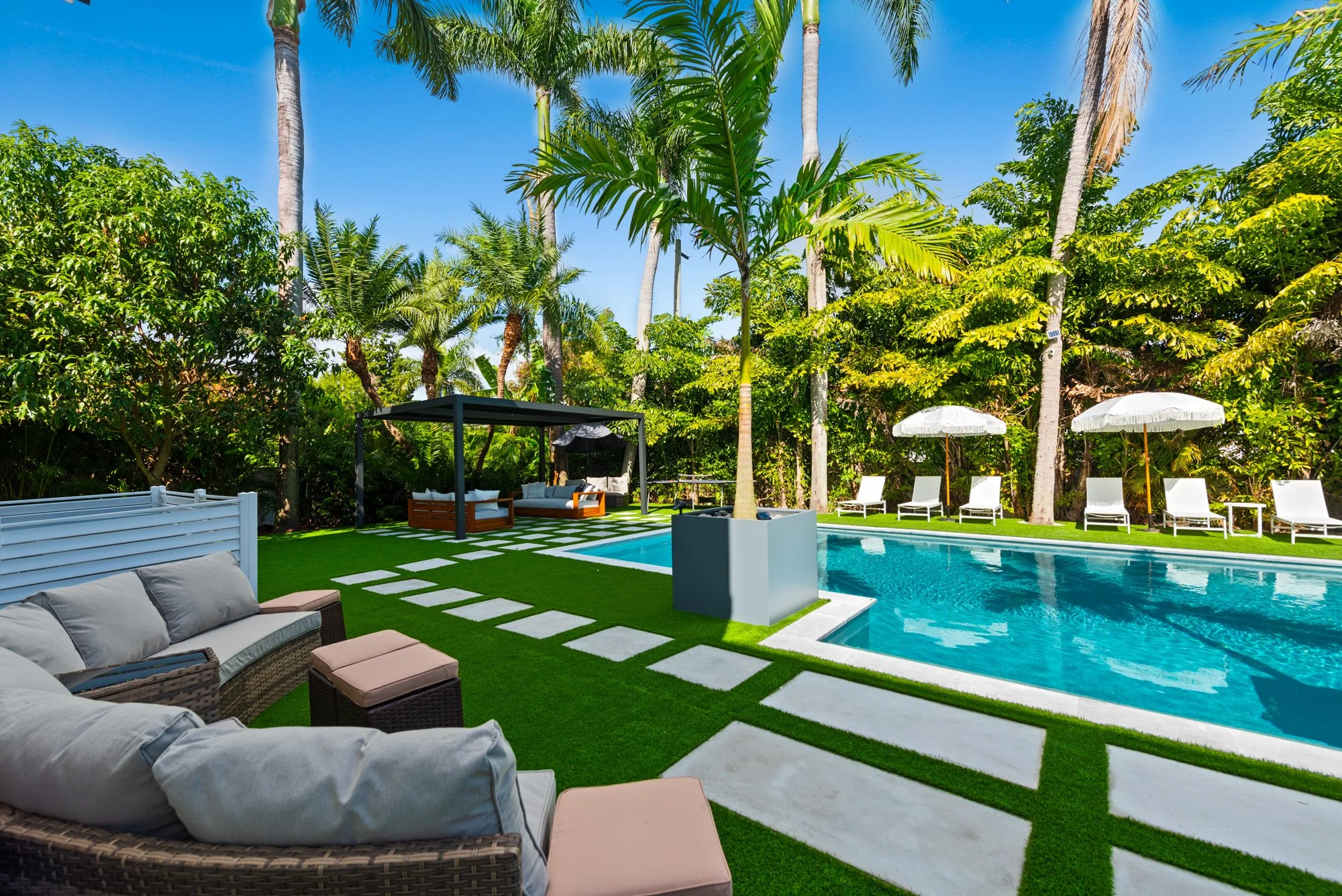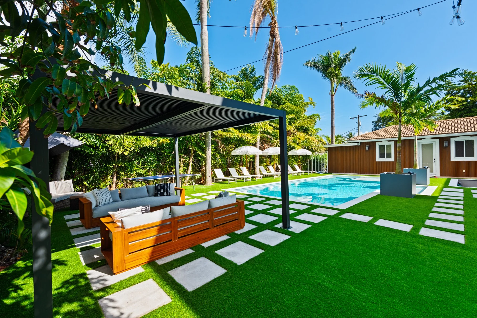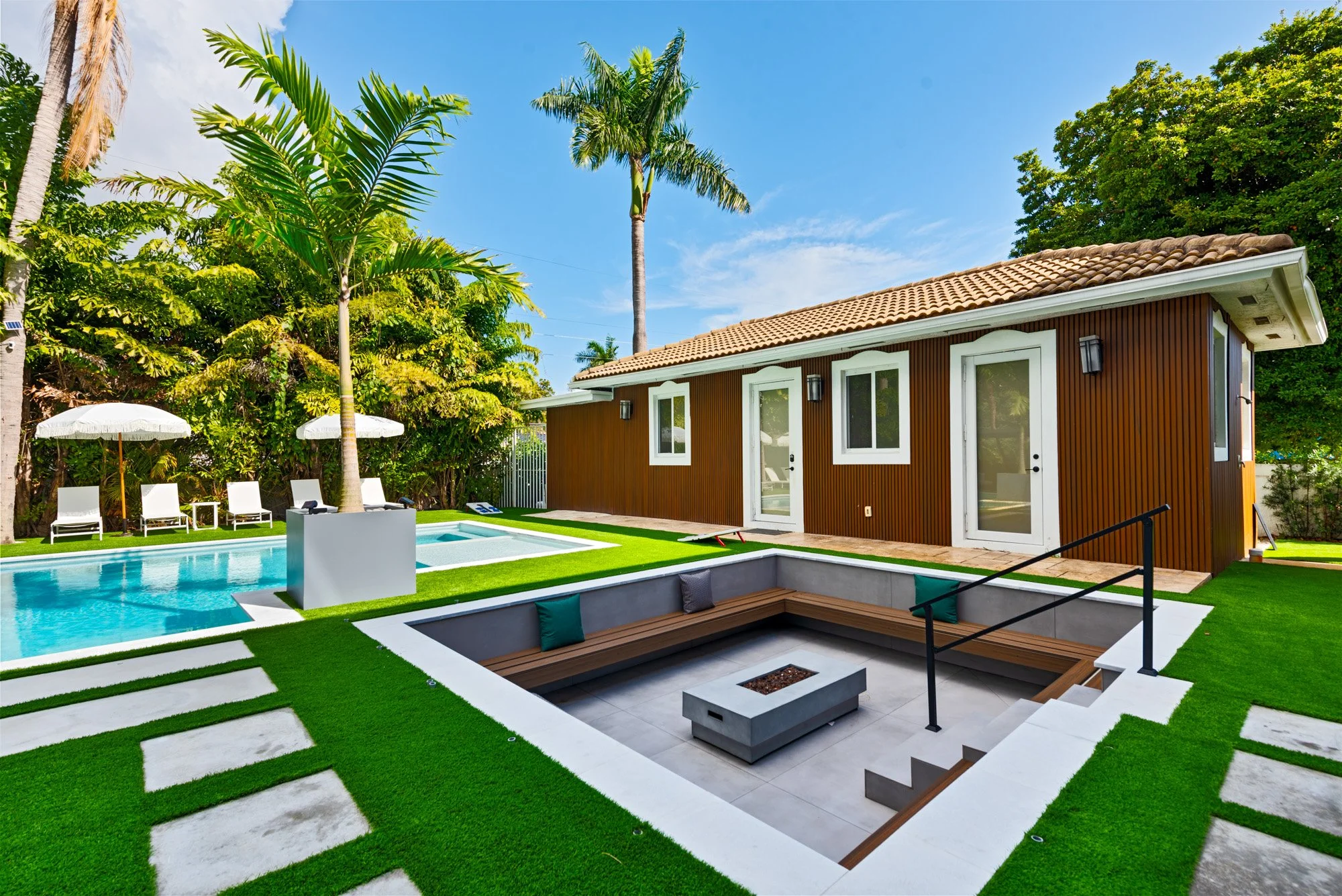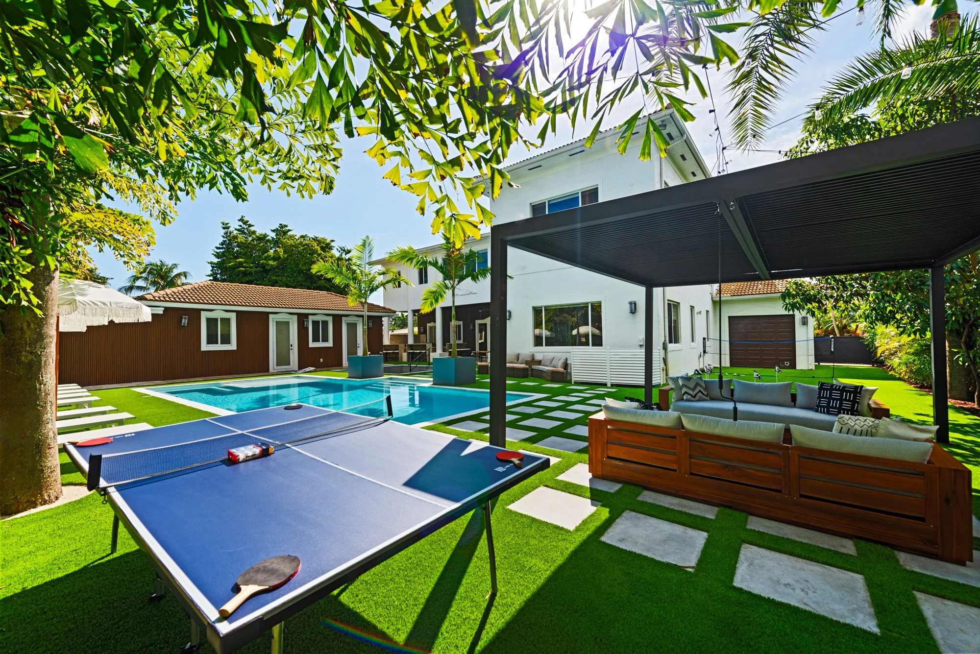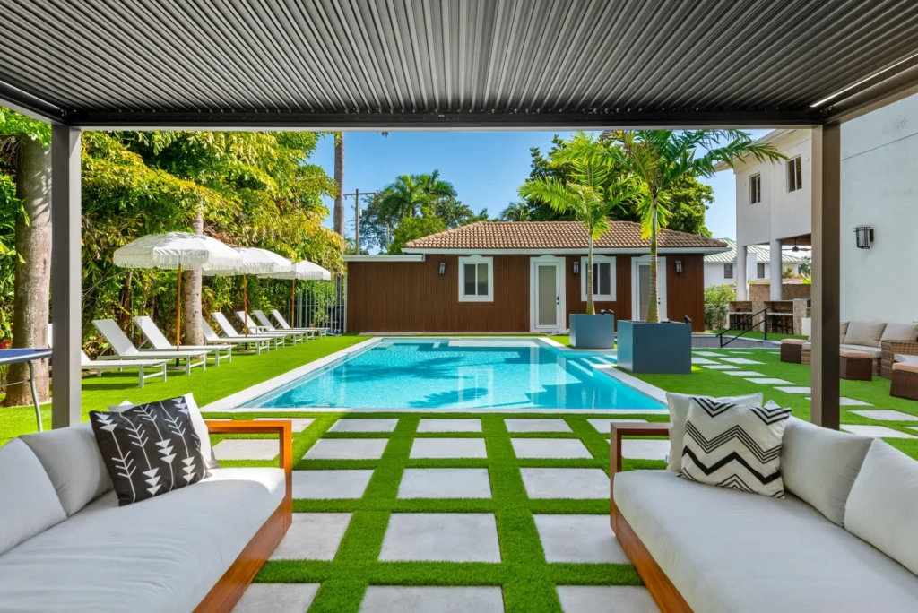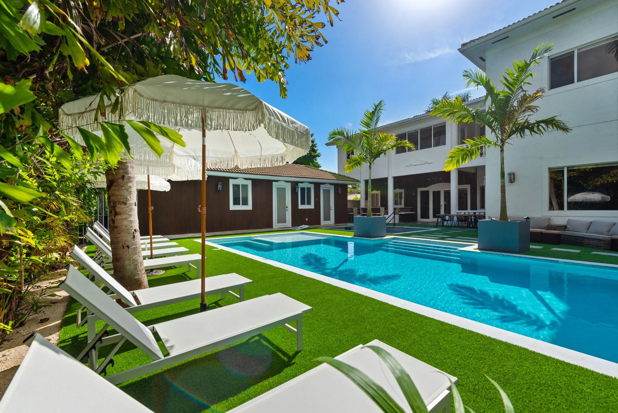 Step outside to discover a tranquil koi pond, along with fun activities like badminton and mini golf. Gather around the contemporary sunken fire pit in the expansive backyard, perfect for memorable evenings. Combining a prime location with sophisticated design, The Tortuga Villa sets the stage for extraordinary celebrations and luxurious escapes — the ultimate Miami lifestyle where comfort seamlessly blends with grandeur.