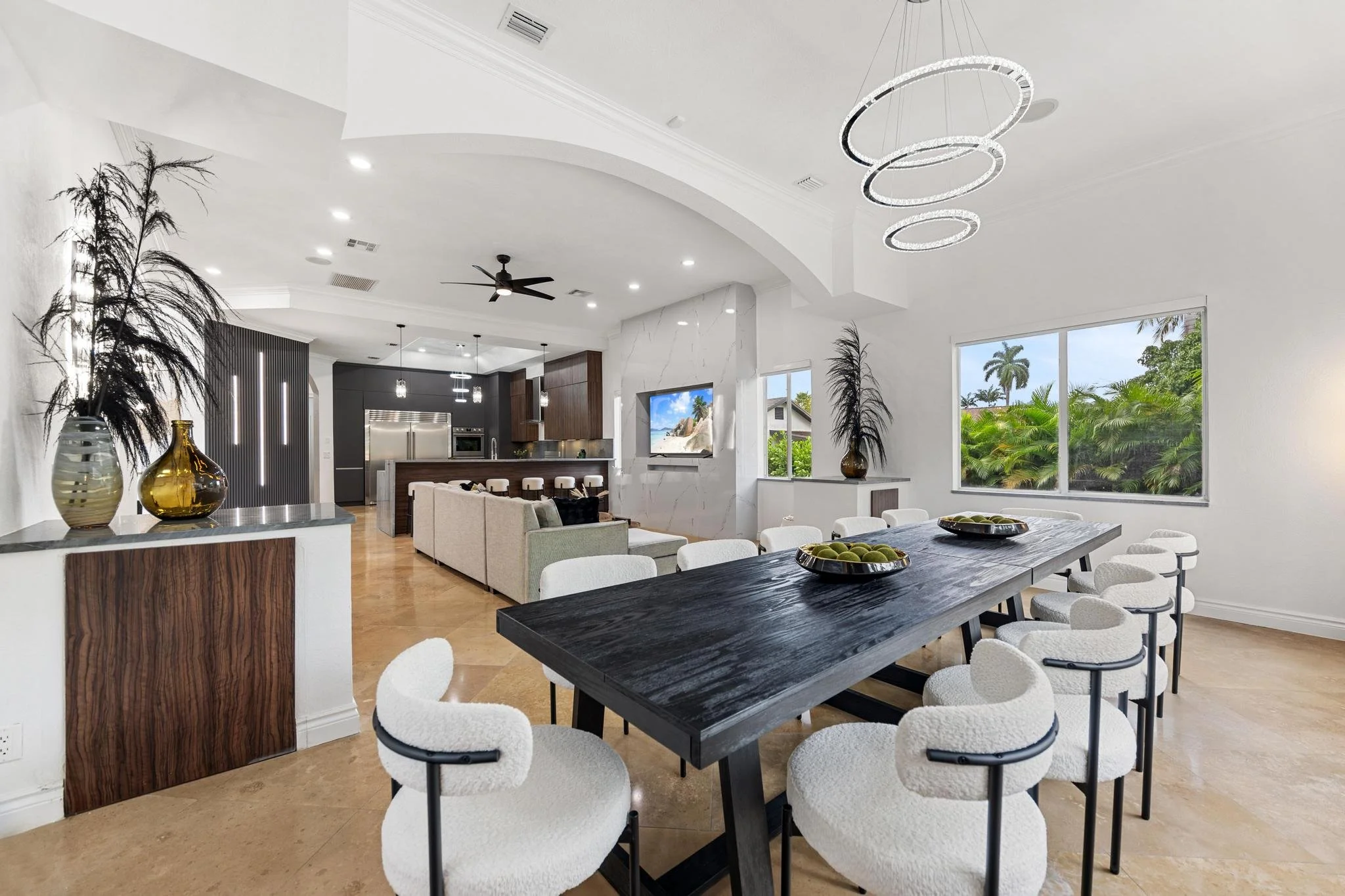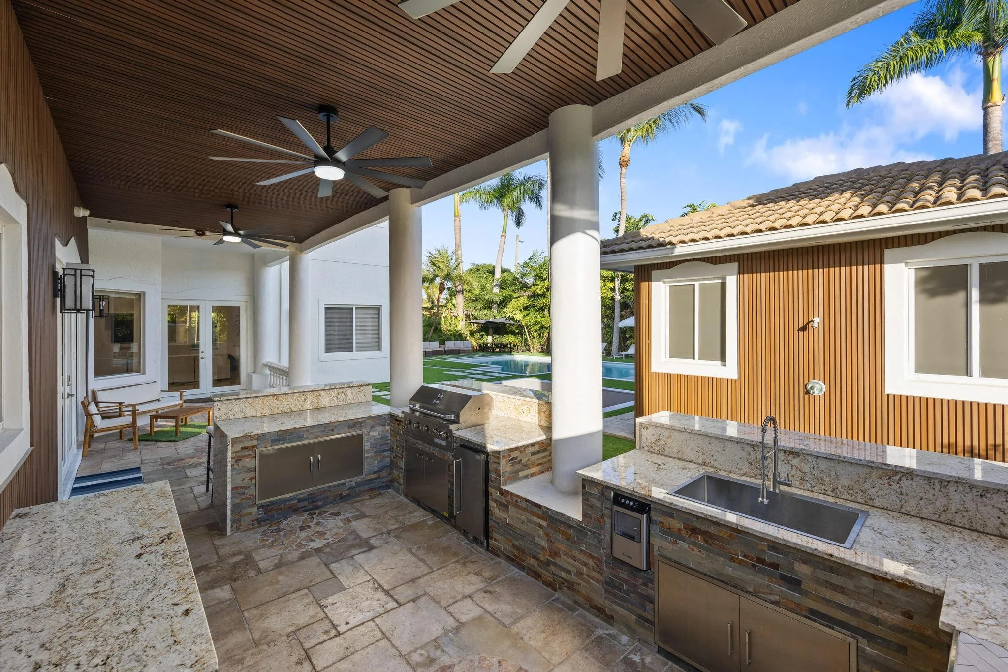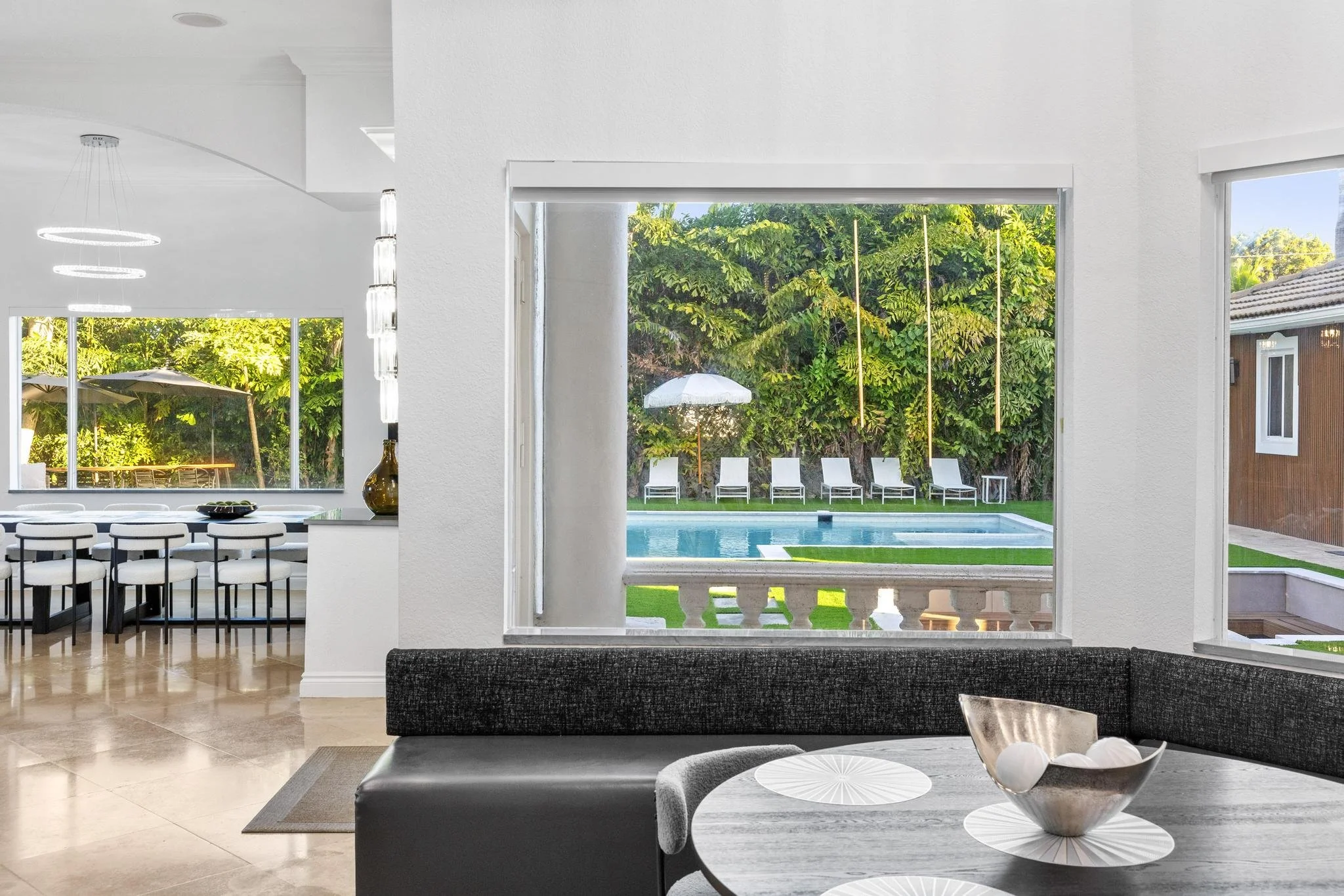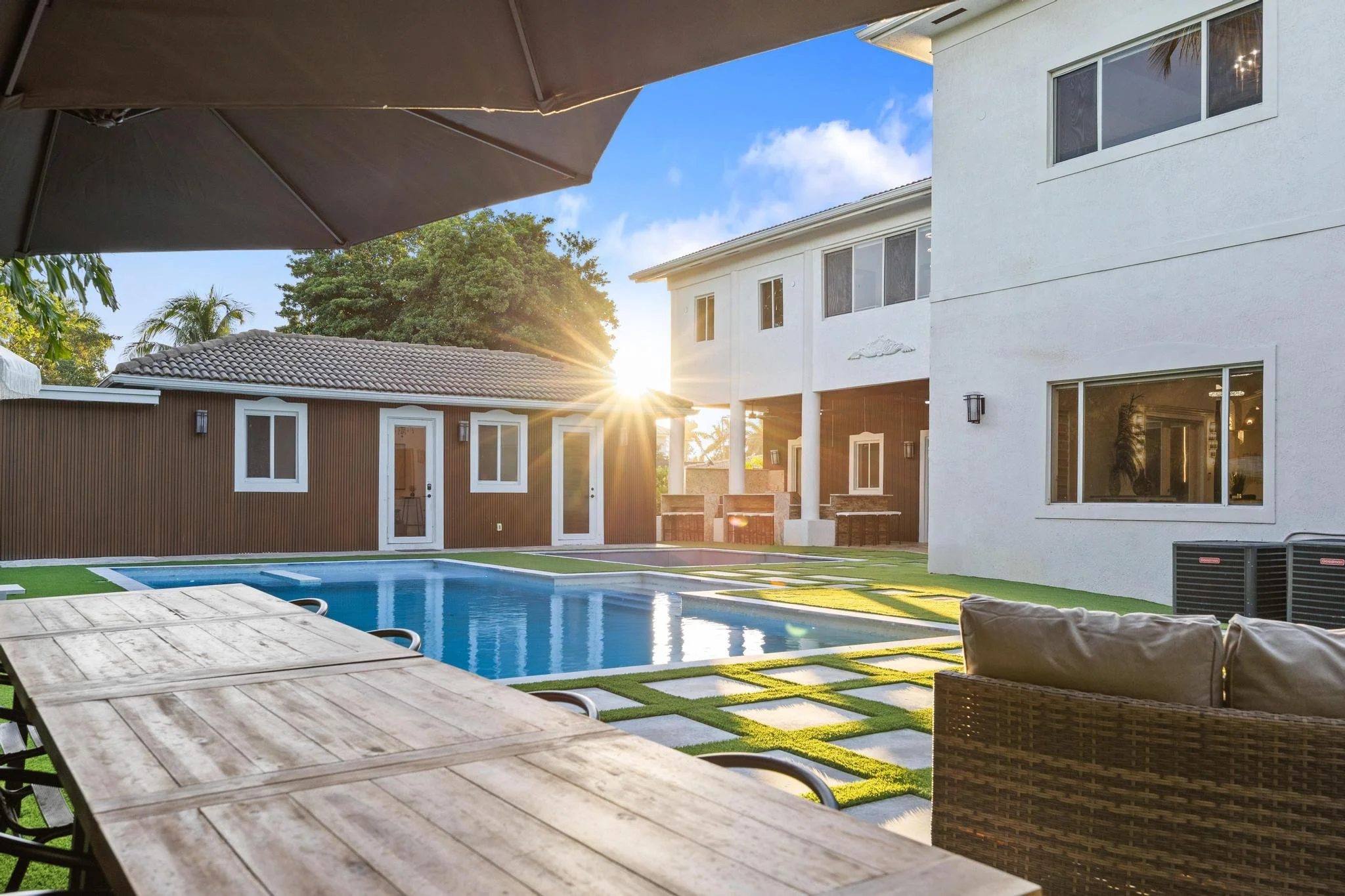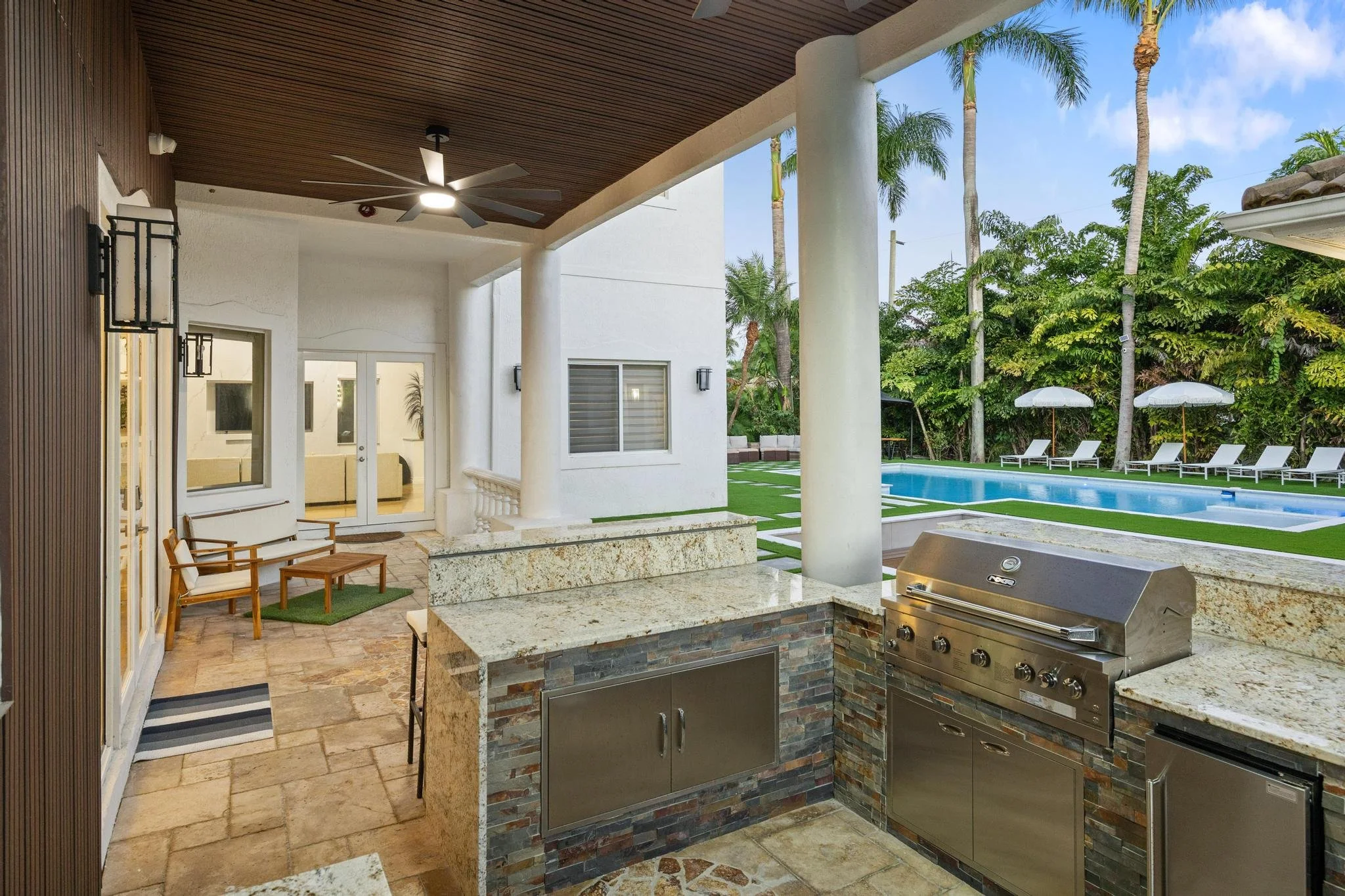 Step outside to discover a tranquil koi pond, along with fun activities like badminton and mini golf. Gather around the contemporary sunken fire pit in the expansive backyard, perfect for memorable evenings. Combining a prime location with sophisticated design, The Tortuga Villa sets the stage for extraordinary celebrations and luxurious escapes — the ultimate Miami lifestyle where comfort seamlessly blends with grandeur.