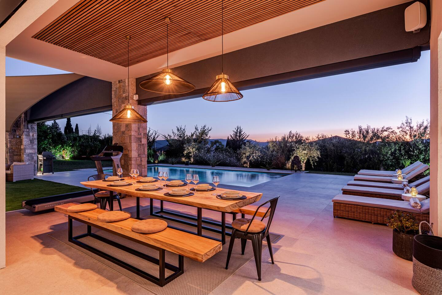True to its name, the estate is renowned for its expansive gardens covering 14,000 square meters. Guests can wander through beautifully landscaped walkways lined with cypress, palm, olive, and fruit trees. This leads to botanic gardens filled with fragrant roses, geraniums, and irises. An impressive vegetable garden supports fresh, farm-to-table meals prepared by the villa’s chef. The grounds also feature unique sculptures, including an imposing T-rex and a majestic wild horse. Blending modern art with natural beauty.